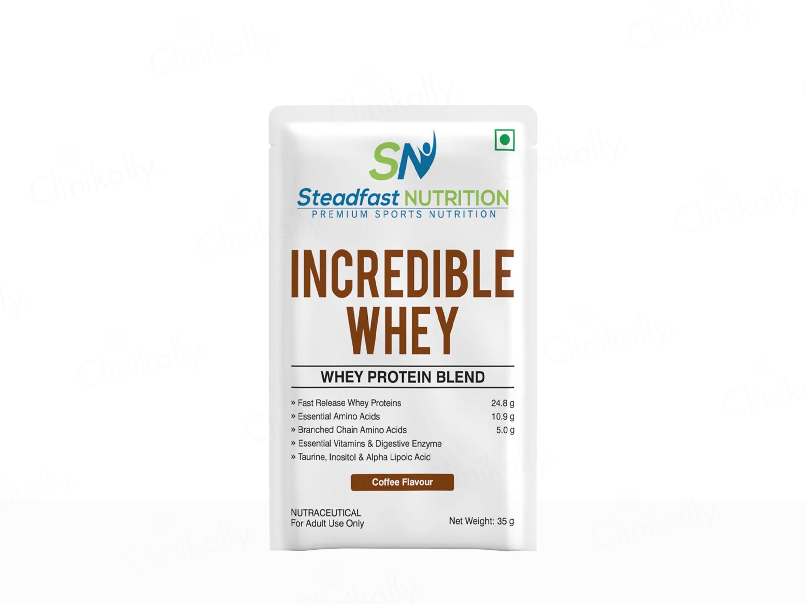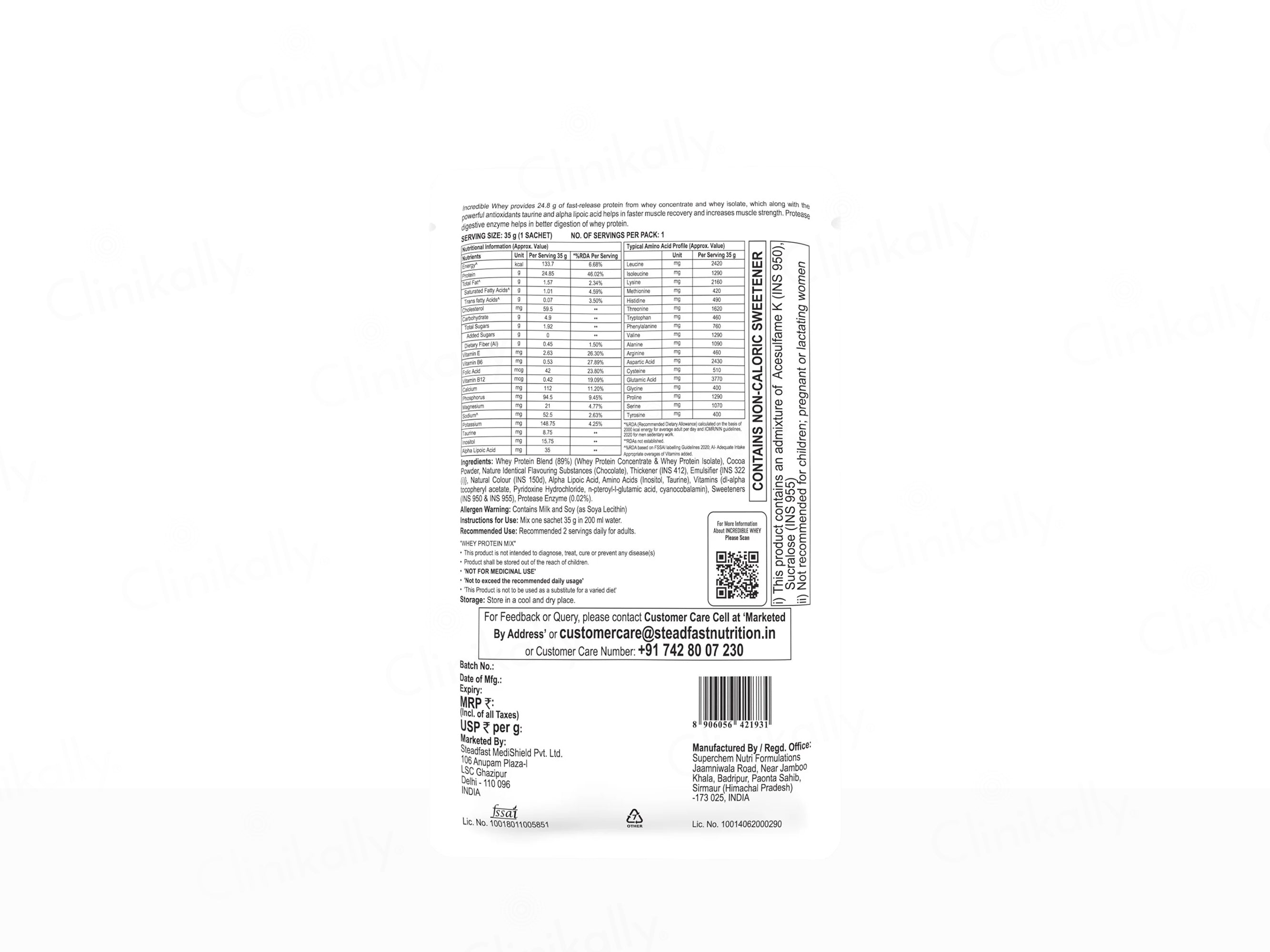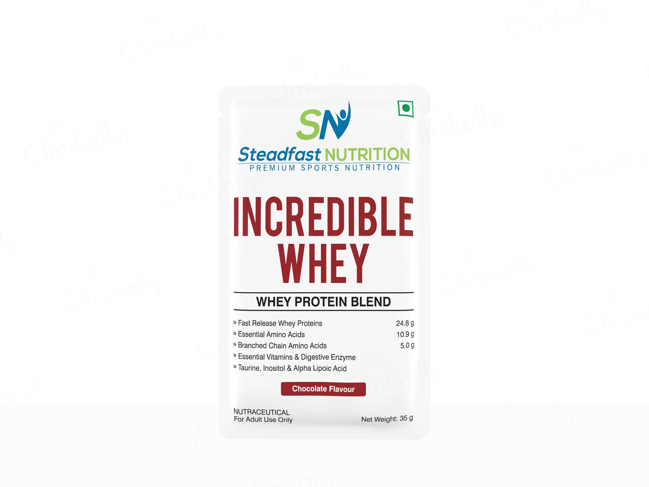 Steadfast Nutrition Incredible Whey Protein Blend Sachet is a premium sports nutrition supplement formulated to support muscle growth and recovery, delivering 24.8 g of fast-release protein from a blend of whey protein concentrate and whey protein isolate per 35 g serving to enhance muscle synthesis and repair. Enriched with 10.9 g of essential amino acids, 5.0 g of branched-chain amino acids (Leucine, Isoleucine, Valine), protease enzyme, alpha-lipoic acid, inositol, taurine, and essential vitamins and minerals (including Vitamin B6, B12, E, folic acid, calcium, phosphorus, magnesium, sodium, potassium), it boosts immunity, reduces inflammation, and expedites recovery, ideal for strength and endurance athletes when mixed with 200 ml of water or milk and consumed as directed.