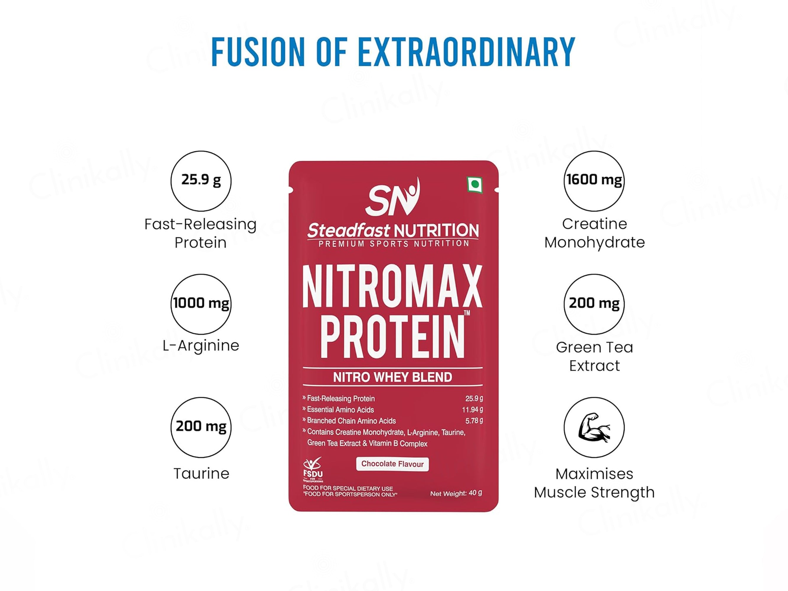 Steadfast Nutrition Nitromax Protein Nitro Whey Blend is a supplement with 25.9 g of fast-releasing whey protein designed to enhance muscle strength, recovery, and endurance.