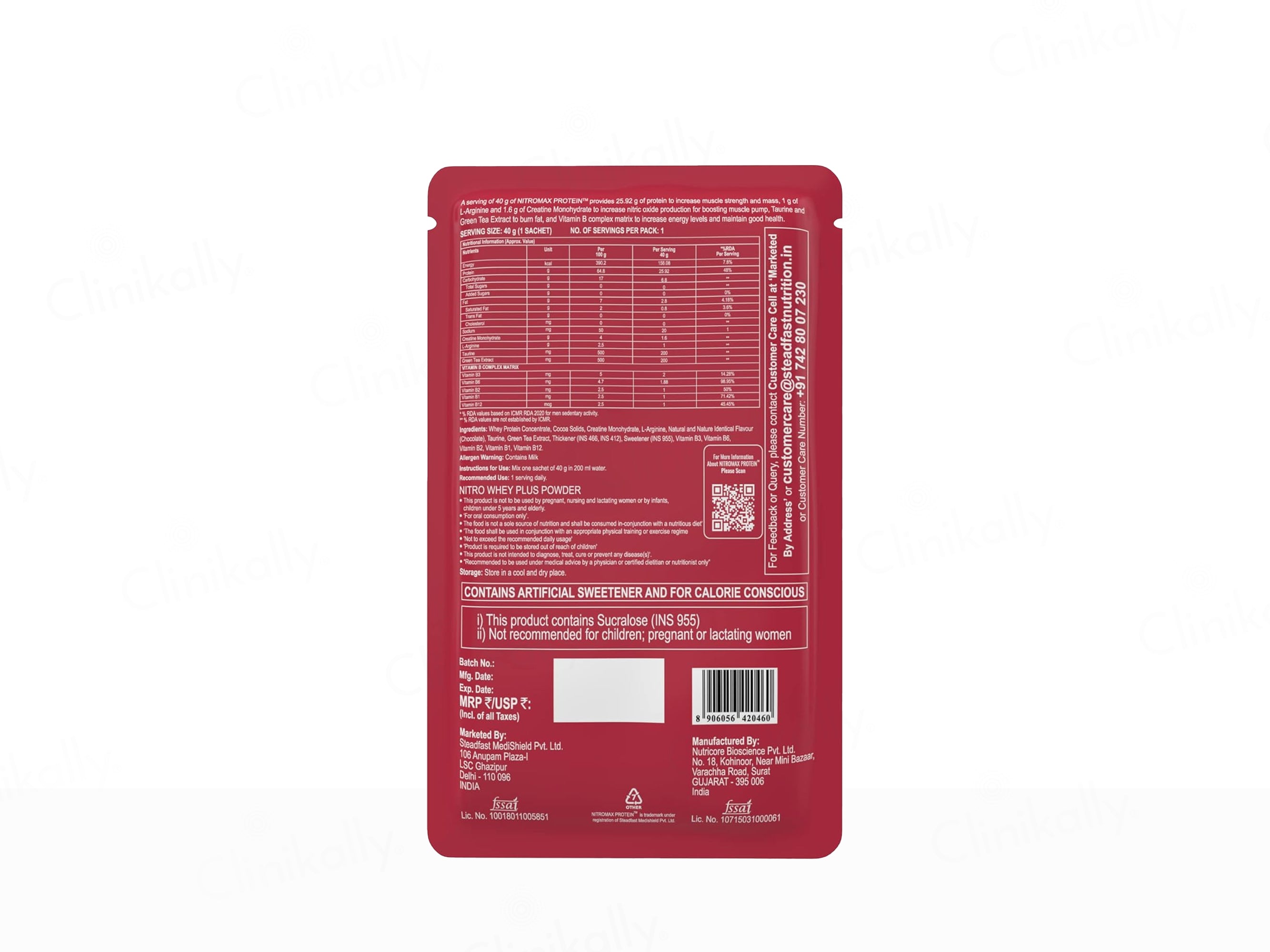 Steadfast Nutrition Nitromax Protein Nitro Whey Blend is a premium sports nutrition supplement formulated to enhance exercise performance and muscle recovery, providing 25.9 g of fast-releasing whey protein concentrate per 40 g serving, enriched with 11.94 g of essential amino acids, 5.78 g of branched-chain amino acids, 1.6 g of Creatine Monohydrate, 1 g of L-Arginine, 200 mg of Taurine, Green Tea Extract, and a Vitamin B Complex matrix (including Vitamins B1, B2, B3, B6, B12) to boost muscle strength, energy, and metabolism. This blend supports rapid muscle recovery, increases muscle pump, reduces inflammation, and improves endurance by regenerating ATP and aiding nitric oxide production, ideal for gym enthusiasts and athletes when mixed with 200 ml of water or milk and consumed as directed.