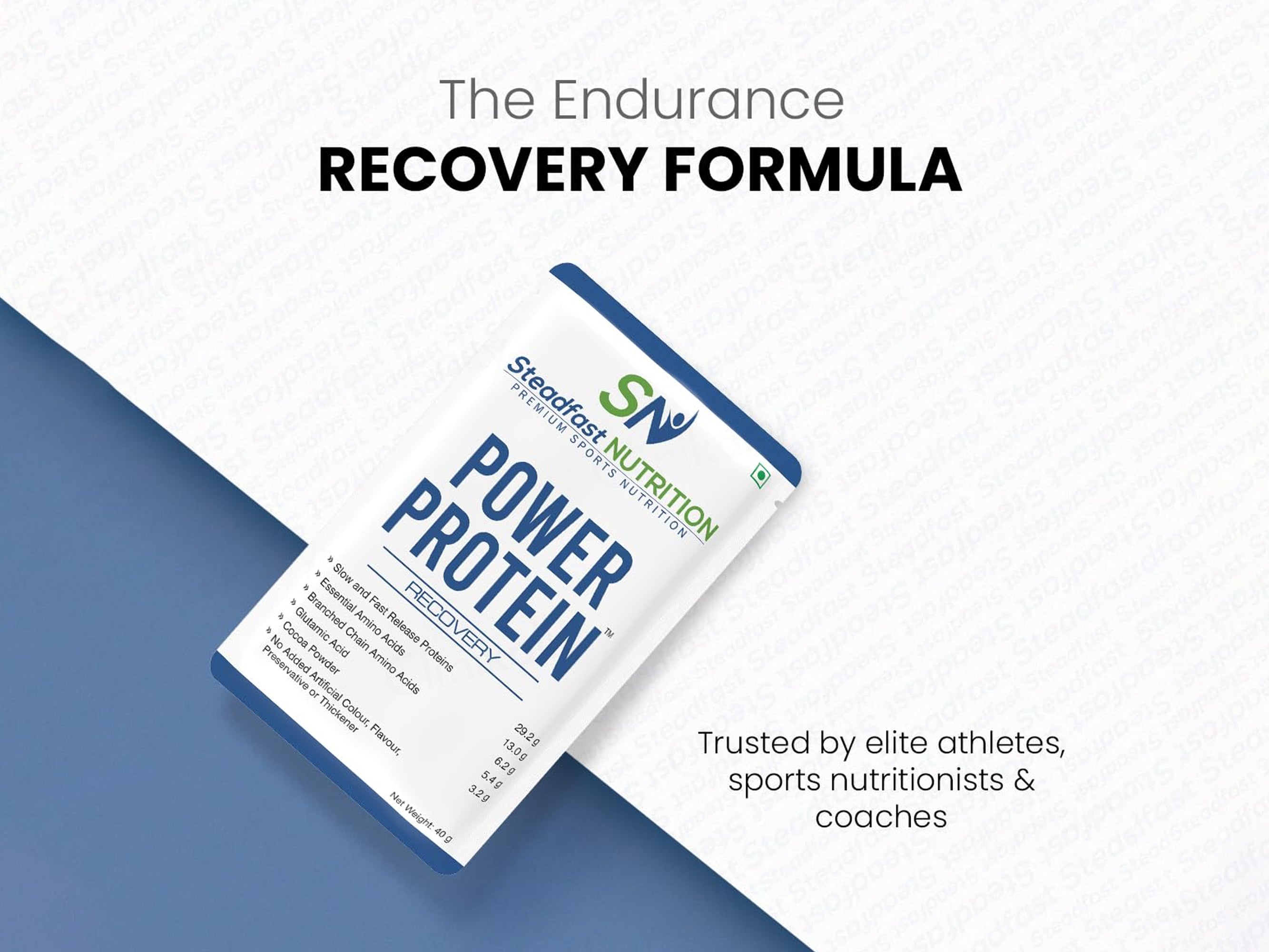 Steadfast Nutrition Power Protein Recovery Sachet is a premium sports nutrition supplement formulated as an endurance recovery formula, providing 29.2 g of slow and fast-release proteins from four sources—Whey Protein Concentrate, Wheat Protein, Calcium Caseinate (10%), and Cocoa Powder (8%)—along with 13 g of essential amino acids, 6.2 g of branched-chain amino acids (Leucine, Isoleucine, Valine), 5.4 g of glutamic acid, and electrolytes including Sodium Chloride and Potassium Chloride to support muscle recovery and performance. Free from added artificial colors, flavors, preservatives, and thickeners, this 40 g sachet aids in instant and sustained muscle recovery, enhances endurance, and supports overall athletic performance when mixed with 300 ml of water or milk and consumed as directed.