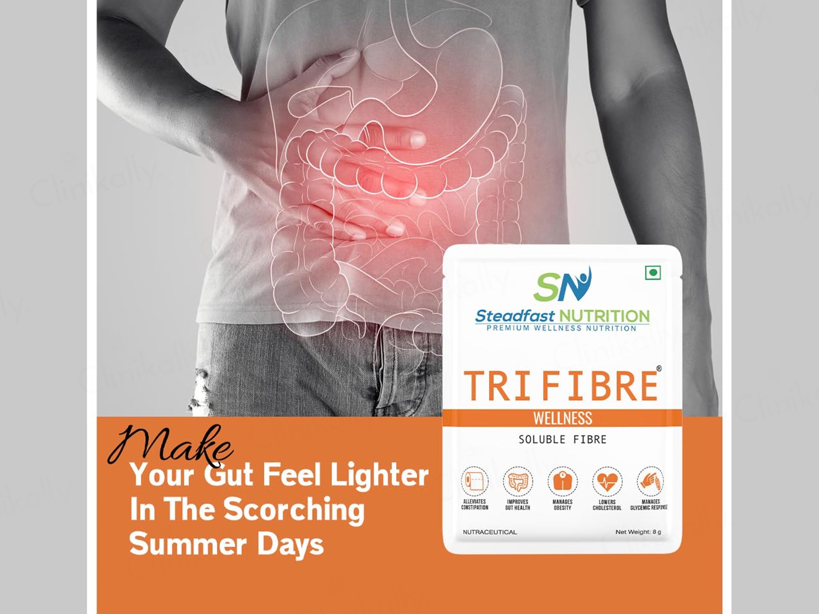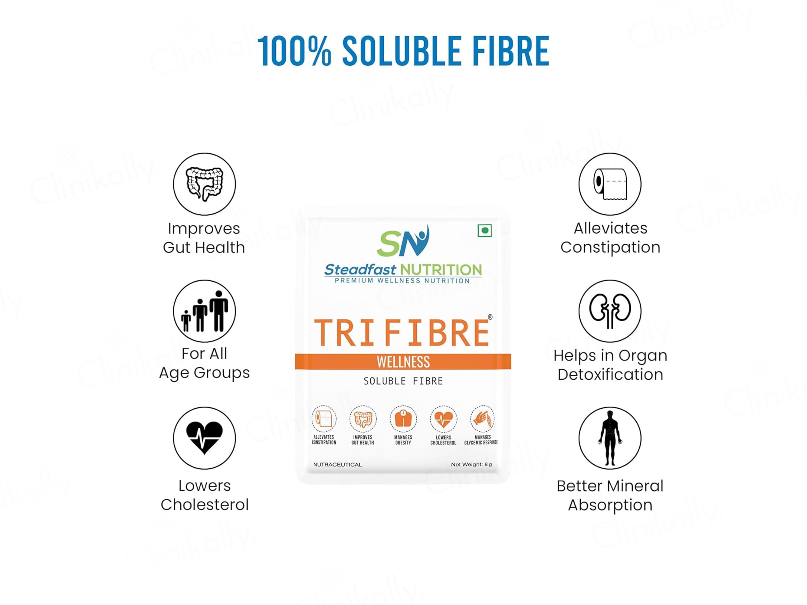 Steadfast Nutrition Tri Fibre Wellness Clear Soluble Fibre Sachet is a premium wellness supplement formulated to enhance digestive health and overall well-being, featuring a low-calorie blend of 100% soluble fibre with Resistant Maltodextrin, Inulin, and Partially Hydrolysed Guar Gum to improve colon health and support beneficial gut bacteria. Each 8 g sachet provides essential fibre to alleviate constipation, manage obesity, lower cholesterol, regulate glycemic response, improve gut health, aid in organ detoxification, and enhance mineral absorption, suitable for all age groups when consumed as recommended. This tasteless, odourless, and colourless water-soluble fibre is easy to mix with water or food, offering satiety and supporting a balanced diet for individuals seeking better digestive and metabolic health.
