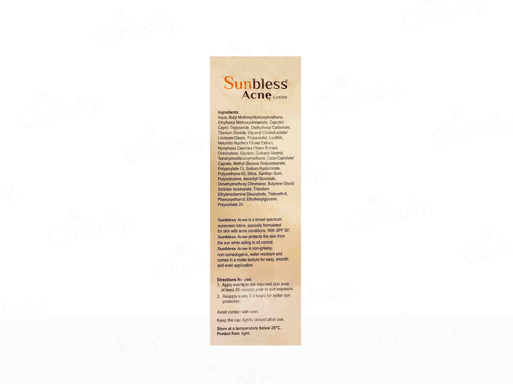 Sunbless Acne Lotion SPF 50+ PA+++ is a specialized sunscreen designed to provide high-level protection for acne-prone skin. Formulated with broad-spectrum SPF 50+ and PA+++ ratings, this lotion effectively shields the skin from harmful UVA and UVB rays while preventing sun damage and breakouts. Its lightweight, non-comedogenic formula absorbs quickly, ensuring a matte finish that hydrates without clogging pores. Ideal for daily use, Sunbless Acne Lotion is perfect for those looking to protect their skin while managing acne.