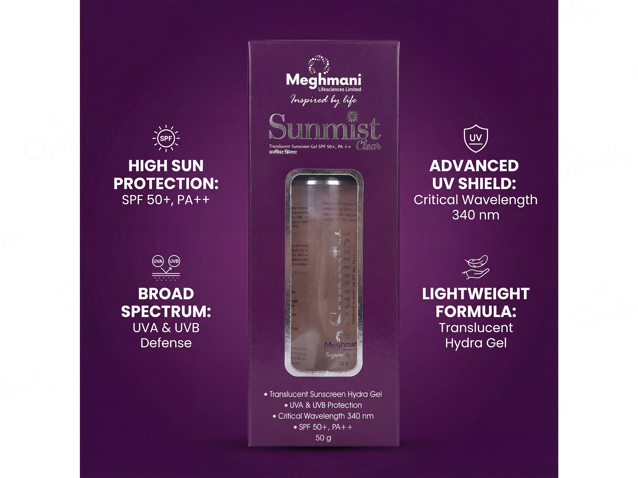 Sunmist Clear Translucent Sunscreen Gel SPF 50+ PA++ is an ultra-lightweight, dermatologist-recommended hydro-gel sunscreen designed to deliver high-level broad-spectrum sun protection without leaving a white cast, making it ideal for daily and outdoor use across all skin types, including oily, acne-prone, and sensitive skin. Formulated to suit Indian skin and environmental conditions, this translucent sunscreen gel blends seamlessly into the skin, helping protect against harmful UVA and UVB rays while preventing sunburn, tanning, and photo-ageing, and keeping the skin feeling fresh and light. Its fast-absorbing, non-sticky texture makes it comfortable for everyday wear and suitable for use under makeup, offering effective protection with a barely-there feel for long hours in the sun.