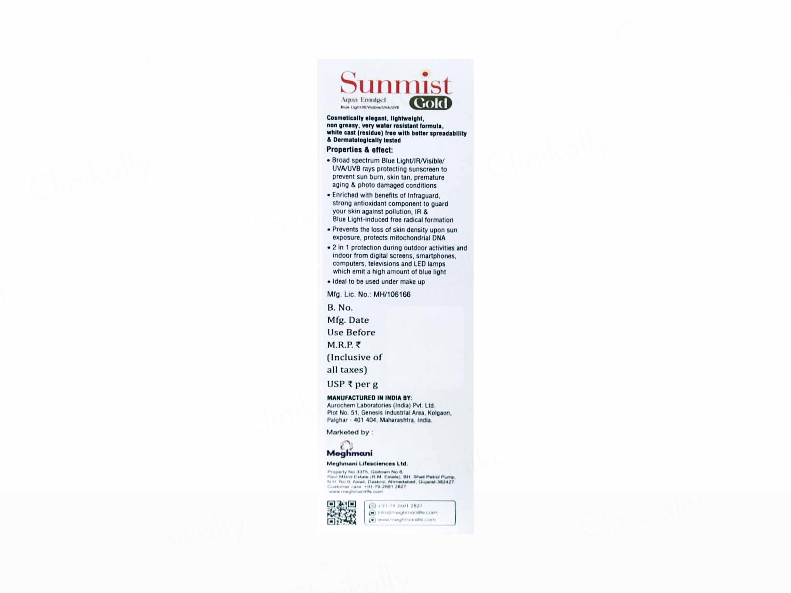 - Apply Sunmist Gold Aqua Emulgel Sunscreen SPF 80+ PA++++ liberally and evenly on the face, neck, and exposed areas 20–30 minutes before sun exposure; reapply every 2–3 hours during continuous sun exposure or after swimming or excessive perspiration.