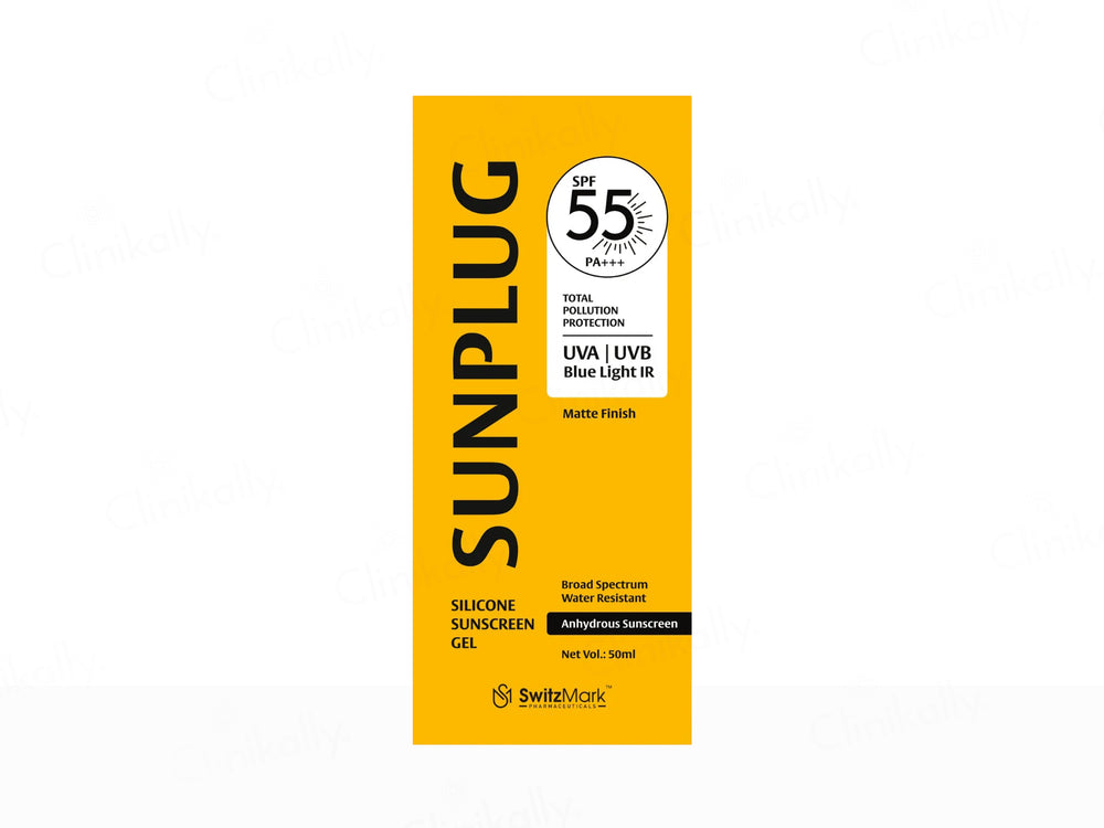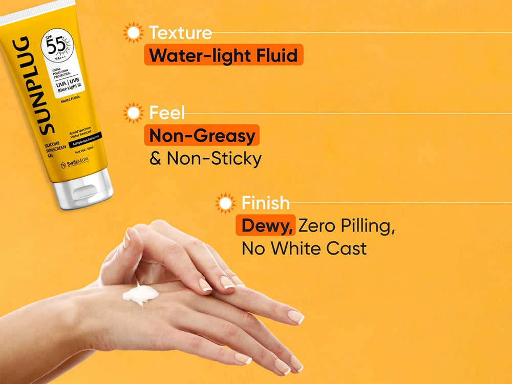 Sunplug Silicone Anhydrous Matte Finish Sunscreen Gel SPF 55 PA+++ is a high-performance sunscreen designed to provide robust broad-spectrum UV protection, control oil, and deliver a matte, non-shiny finish for a smooth complexion. Infused with zinc oxide, titanium dioxide, and niacinamide, it shields against UVA/UVB rays, prevents sunburn, and reduces redness while keeping skin shine-free. Its anhydrous, silicone-based gel formula blends effortlessly with no white cast. Suitable for all skin types, especially oily skin, this sunscreen ensures daily protection with a matte look.