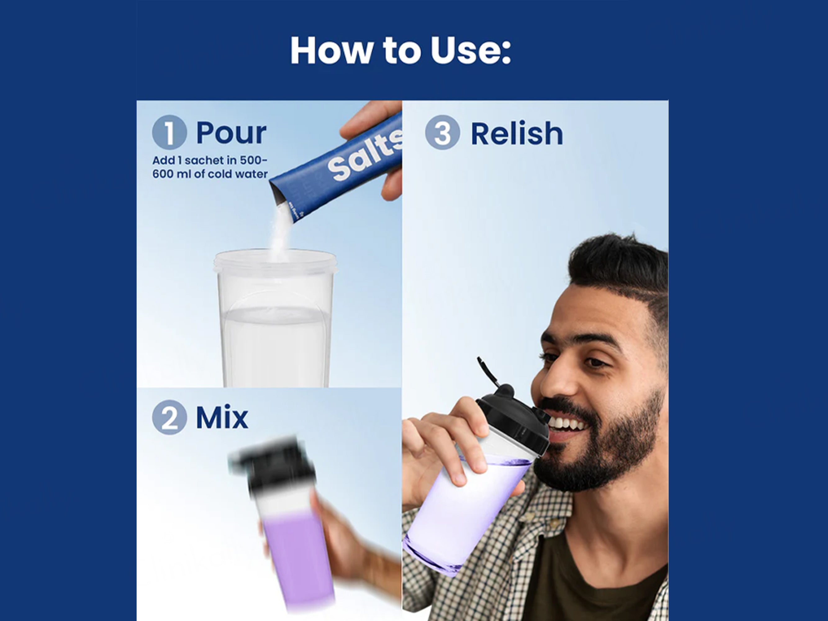 - Mix one serving of Supply6 Salts Electrolyte Mix with water or your favorite beverage.