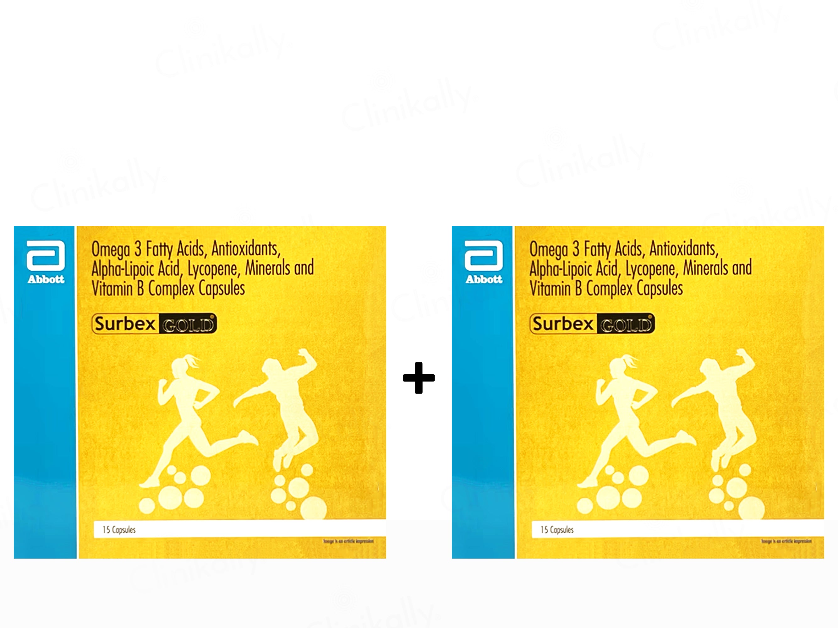 Surbex Gold Capsule is a premium multivitamin and antioxidant formulation designed to support overall vitality, energy, and cellular protection through a unique blend of essential vitamins, minerals, and omega fatty acids. It contains key ingredients including Alpha Lipoic Acid, Lycopene, Omega-3 Fatty Acids (Eicosapentaenoic acid and Docosahexaenoic acid), Selenium, Zinc, Magnesium, Manganese, Folic Acid, Vitamin B6, Vitamin B12, and Chromium to enhance immunity, protect against oxidative stress, and support brain, heart, and metabolic health. The synergistic action of these nutrients helps improve energy metabolism, strengthen antioxidant defense, and promote general well-being, making it suitable for adults seeking comprehensive nutritional support as directed by a healthcare professional.