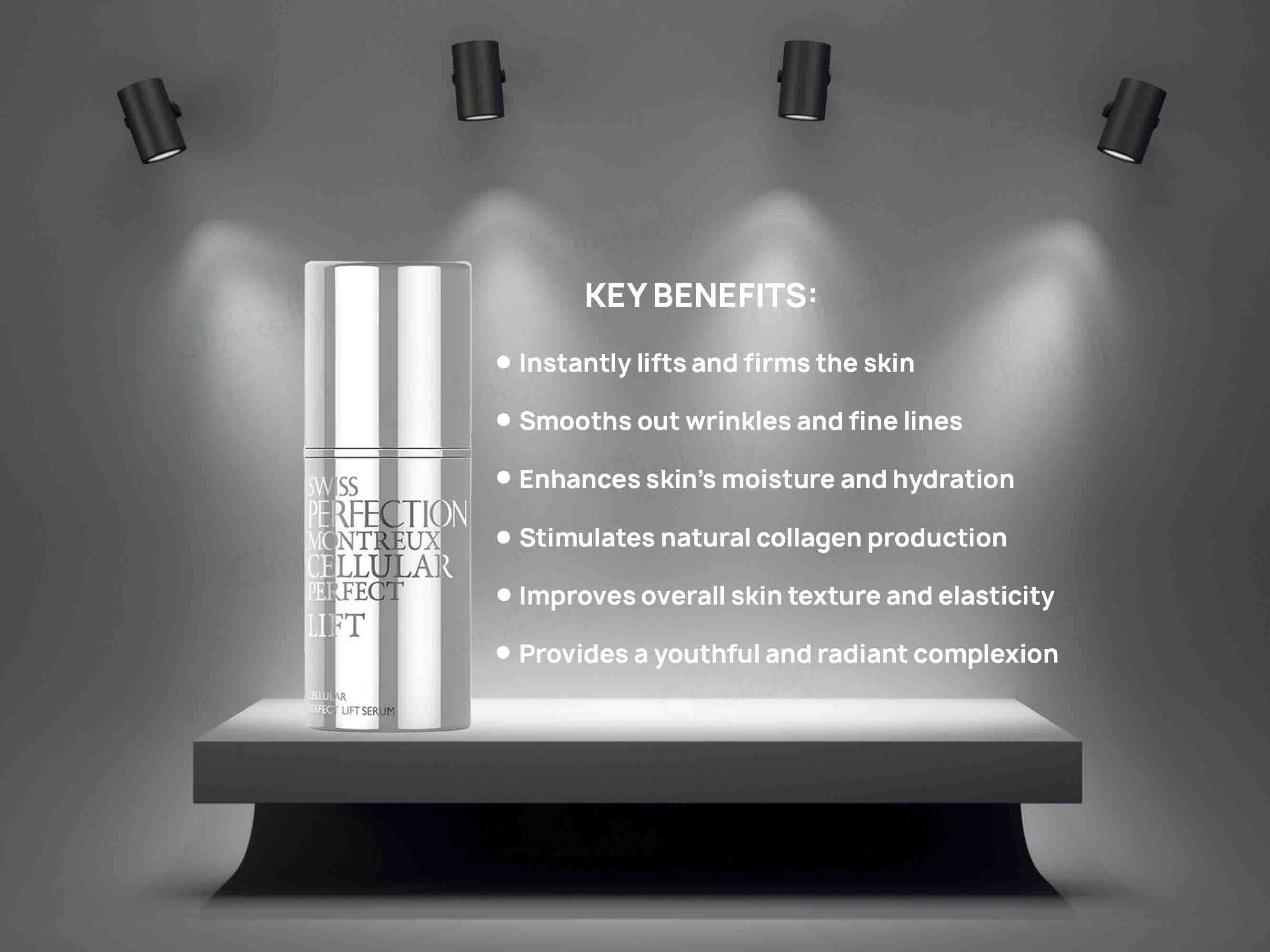 Swiss Perfection Montreux Cellular Perfect Lift Skin Serum provides instant lifting and firming of the skin, smooths out wrinkles and fine lines, enhances skin hydration, stimulates collagen production, and improves skin texture and elasticity for a youthful and radiant complexion.