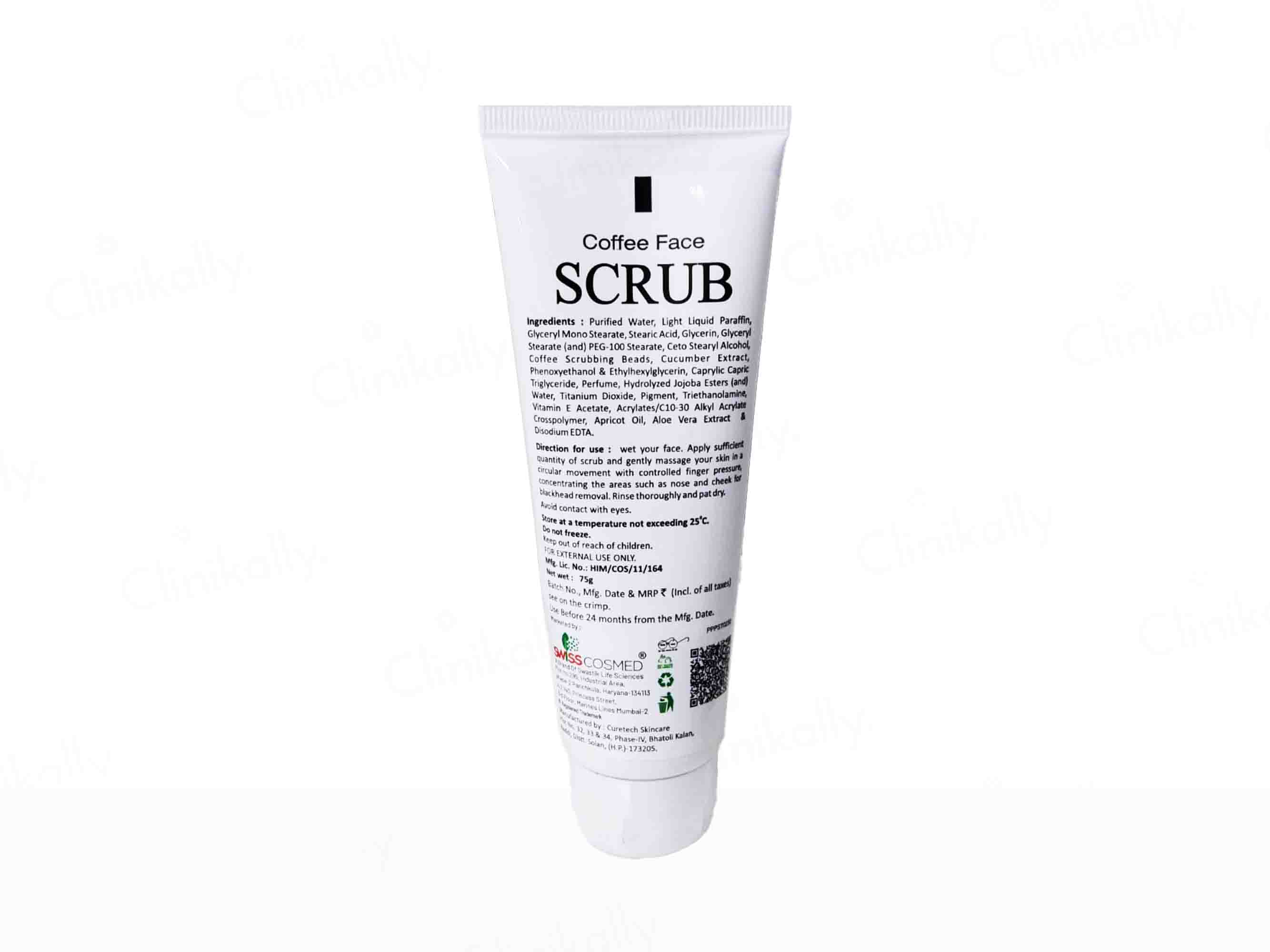Swisscosmed Coffee Exfoliating & Moisturizing Face Scrub is a paraben-free skincare solution designed to exfoliate dead skin cells, control excess oil, and remove blackheads while providing hydration and nourishment. The scrub combines Coffee Scrubbing Beads with natural extracts like Aloe Vera, Cucumber, and Apricot Oil to gently cleanse pores, repair damaged skin, and rejuvenate the complexion. It is enriched with moisturizing and protective agents including Light Liquid Paraffin, Hydrolyzed Jojoba Esters, Glycerin, Aloe Vera Extract, and Vitamin E Acetate, which soften and hydrate the skin. Supporting components such as Stearic Acid, Glyceryl Stearate, Phenoxyethanol, Ethylhexylglycerin, and Caprylic/Capric Triglyceride improve texture, stability, and skin barrier function. By blending exfoliation with moisturization, Swisscosmed Coffee Face Scrub delivers smoother, clearer, and refreshed skin with regular use.