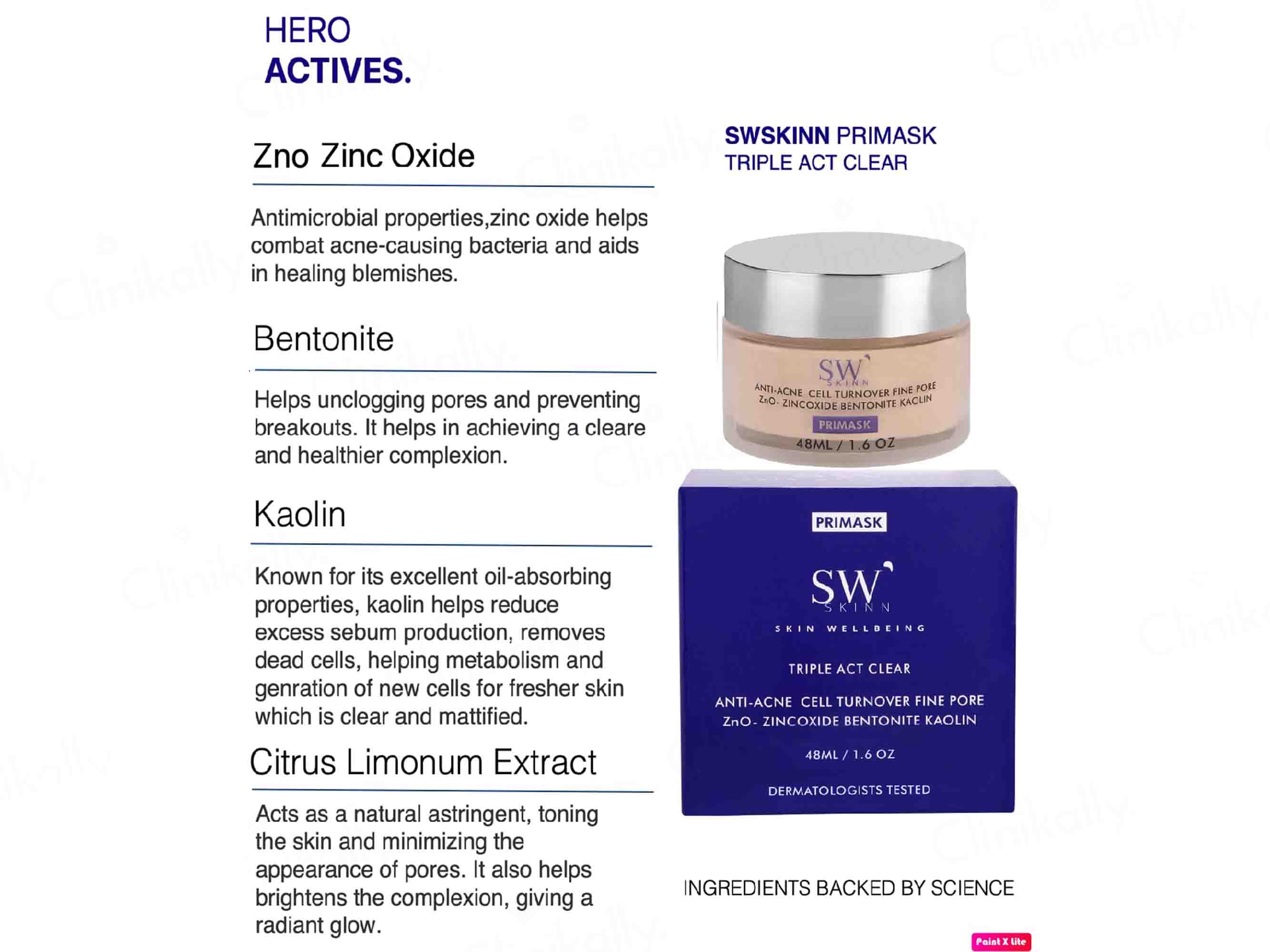 SWSKINN Primask Triple Act Clear Face Mask is a dermatologist-tested formulation designed to target acne, support cell turnover, and refine pores with a blend of natural clays and plant extracts. It combines the antimicrobial and blemish-healing benefits of Zinc Oxide, the pore-unclogging and breakout-preventing action of Bentonite, and the oil-absorbing and sebum-reducing power of Kaolin for a clearer complexion. Enriched with natural botanicals like Citrus Limonum Fruit Extract for toning and minimizing pore appearance, Ocimum Basilicum Oil, Prunus Dulcis Oil, Simmondsia Chinensis Oil, Aegle Marmelos Extract, Trigonella Foenum-Graecum Extract, Nigella Sativa Seed Extract, Curcuma Longa Root Extract, and Cucumis Sativus Juice, this face mask helps brighten skin, support cell regeneration, and improve overall skin health, making it a multi-action treatment for acne-prone and oily skin.