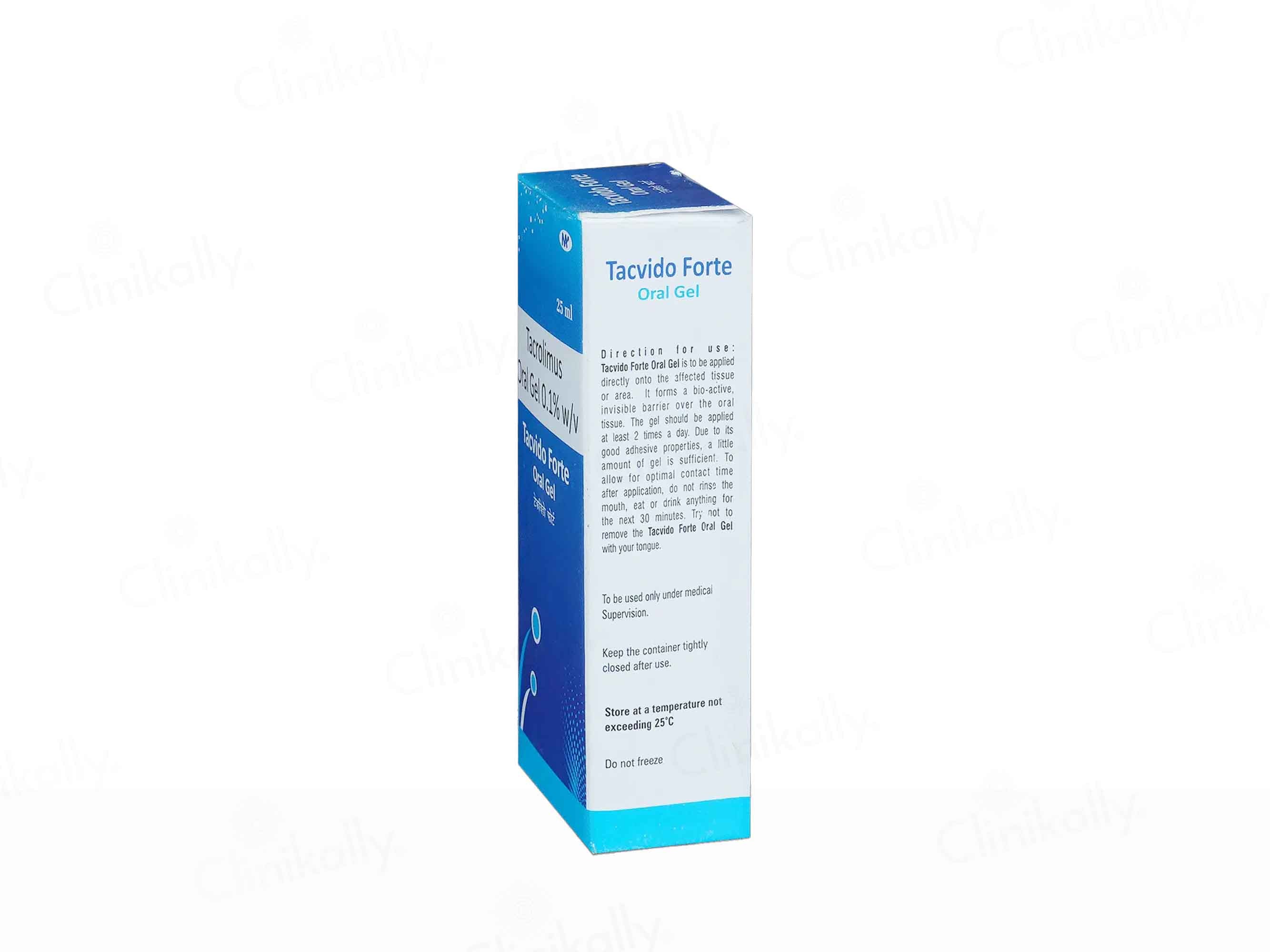 Tacvido Forte Oral Gel, containing 0.1% w/v Tacrolimus, is an effective prescription treatment for oral lichen planus. It alleviates inflammation by blocking calcineurin, an enzyme that activates T lymphocytes causing inflammation. Tacvido Forte provides localized relief with minimal side effects, making it a safe choice for patients. Applied directly to the lesion, it reduces discomfort, but users should avoid eating or drinking for 30 minutes post-application. If symptoms persist after a week, consult your doctor for further guidance.