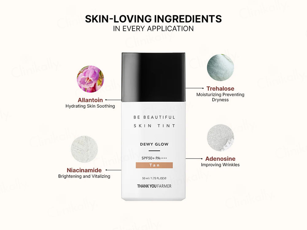 Thank You Farmer Be Beautiful Skin Tint Dewy Glow Moisturiser Sunscreen SPF 50+ PA++++ (Tan) is a versatile skin tint that delivers natural-looking coverage, hydration, and strong sun protection in one step. Infused with niacinamide, adenosine, and vitamin E, it brightens the complexion, blurs imperfections, and supports wrinkle care while maintaining a lightweight, non-greasy feel. The formula blends seamlessly for a transparent, airy finish, controls excess oil, and corrects uneven tone—perfect for a radiant, flawless look every day.