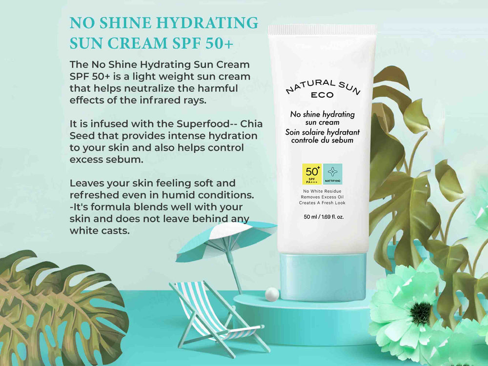 The Face Shop Natural Sun Eco No Shine Hydrating Sun Cream SPF 50+ PA+++ is a lightweight, non-comedogenic sunscreen that delivers powerful sun protection while keeping skin shine-free. Infused with Sunflower Sprout Extracts, Cotton Seeds, Licorice Root, and Chia Seeds, it hydrates deeply and boosts skinโs moisture levels. Its hydrating gel-like formula absorbs quickly without leaving a white cast, making it ideal for oily and combination skin. This mattifying sun cream controls excess sebum, prevents breakouts, and ensures a fresh, smooth look all day.