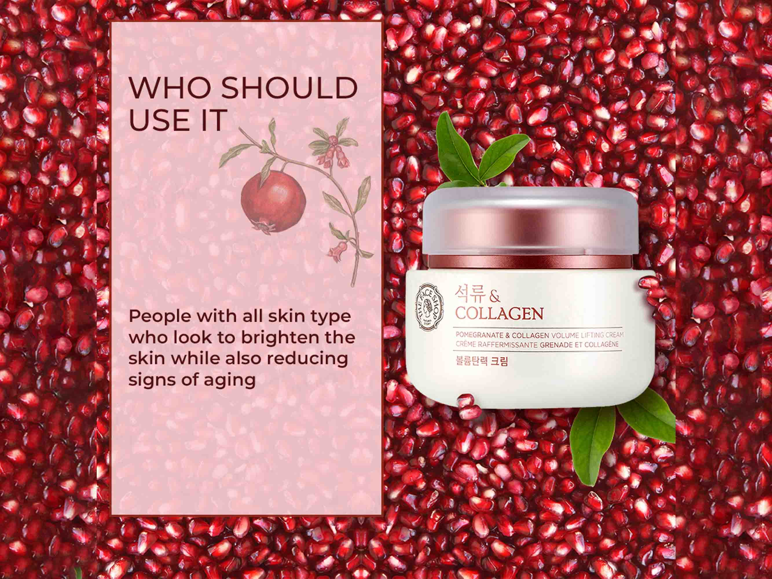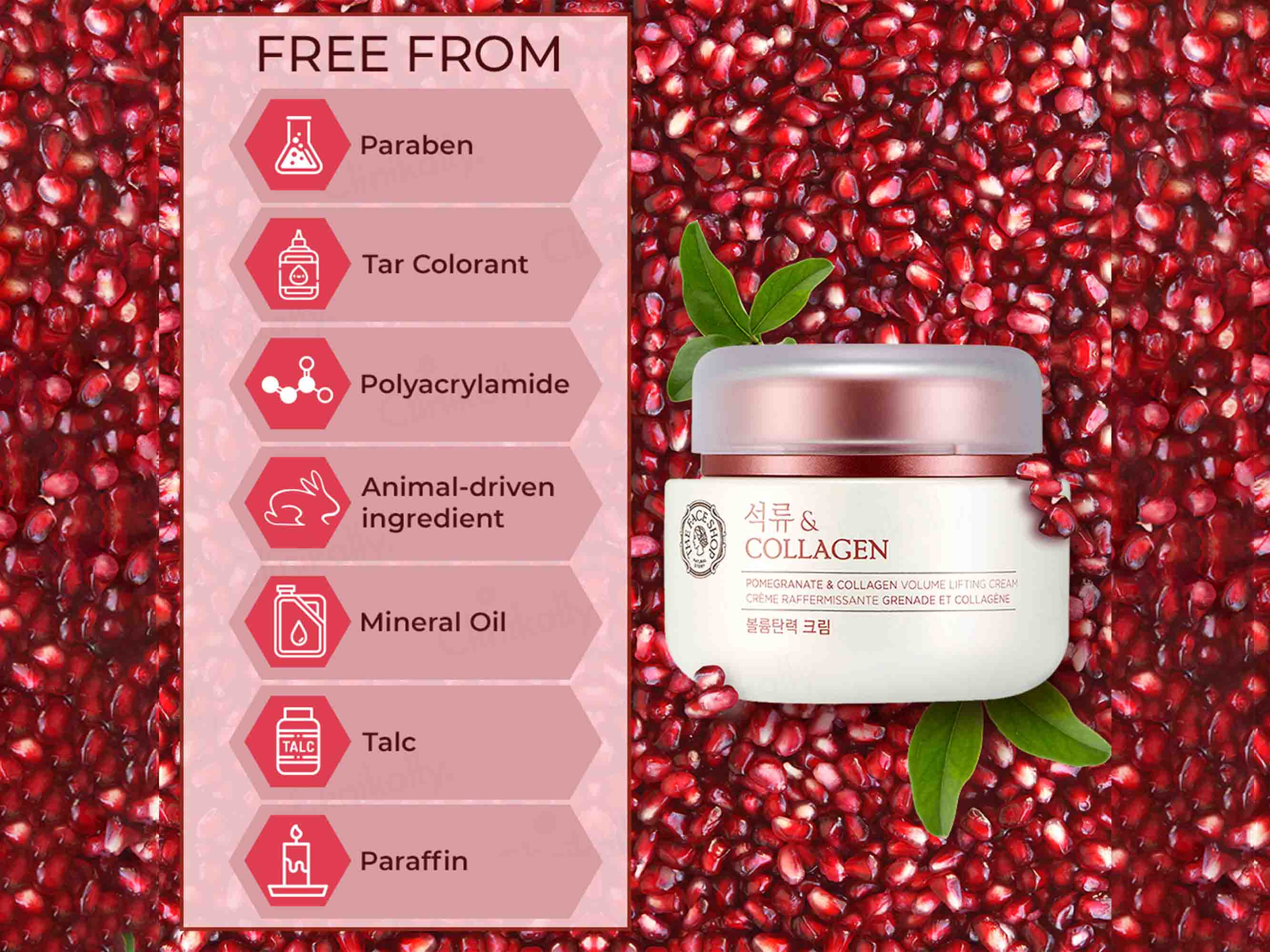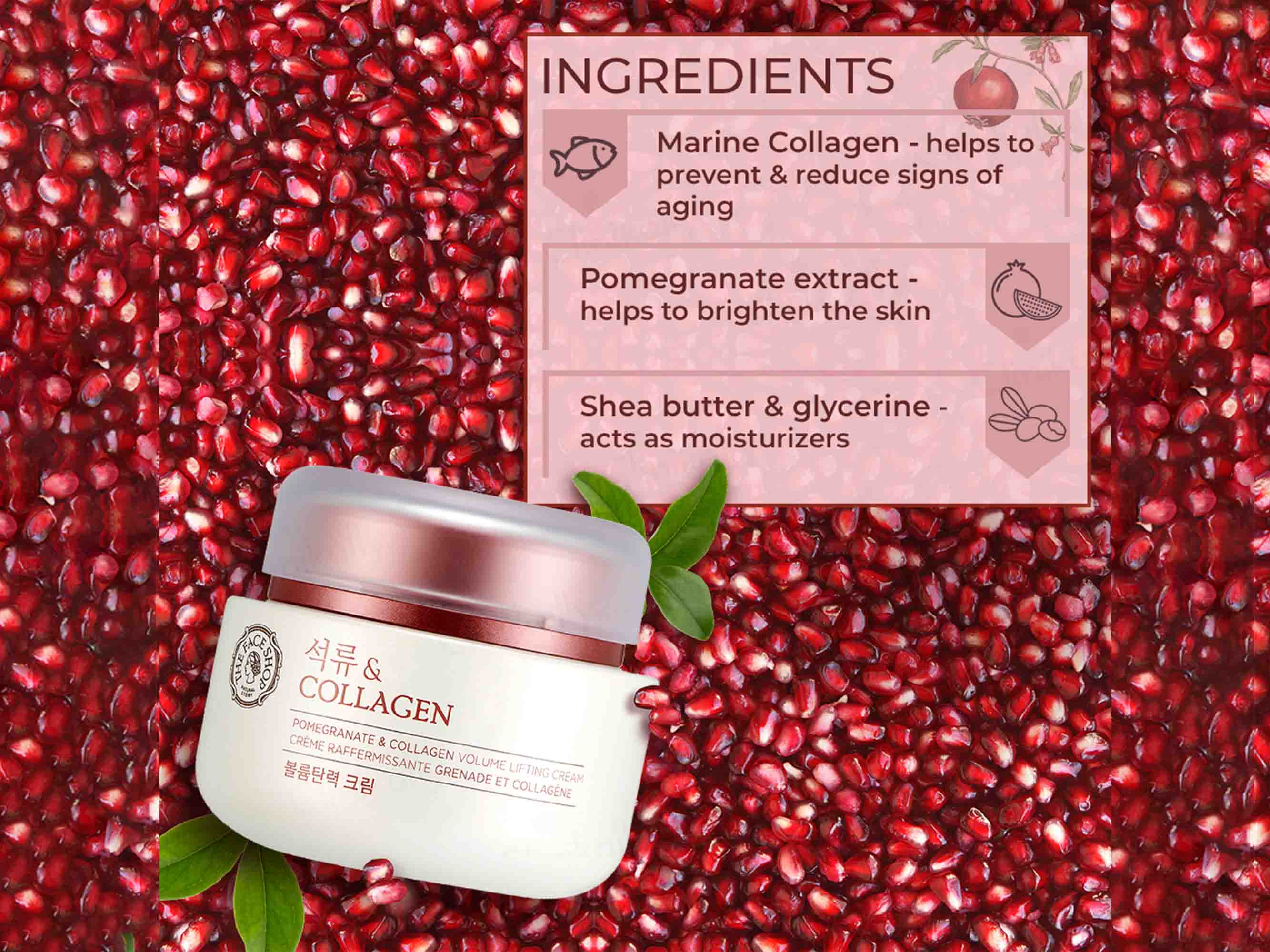 The Face Shop Pomegranate & Collagen Volume Lifting Cream is a skincare product formulated with pomegranate and collagen to deeply nourish and firm the skin.