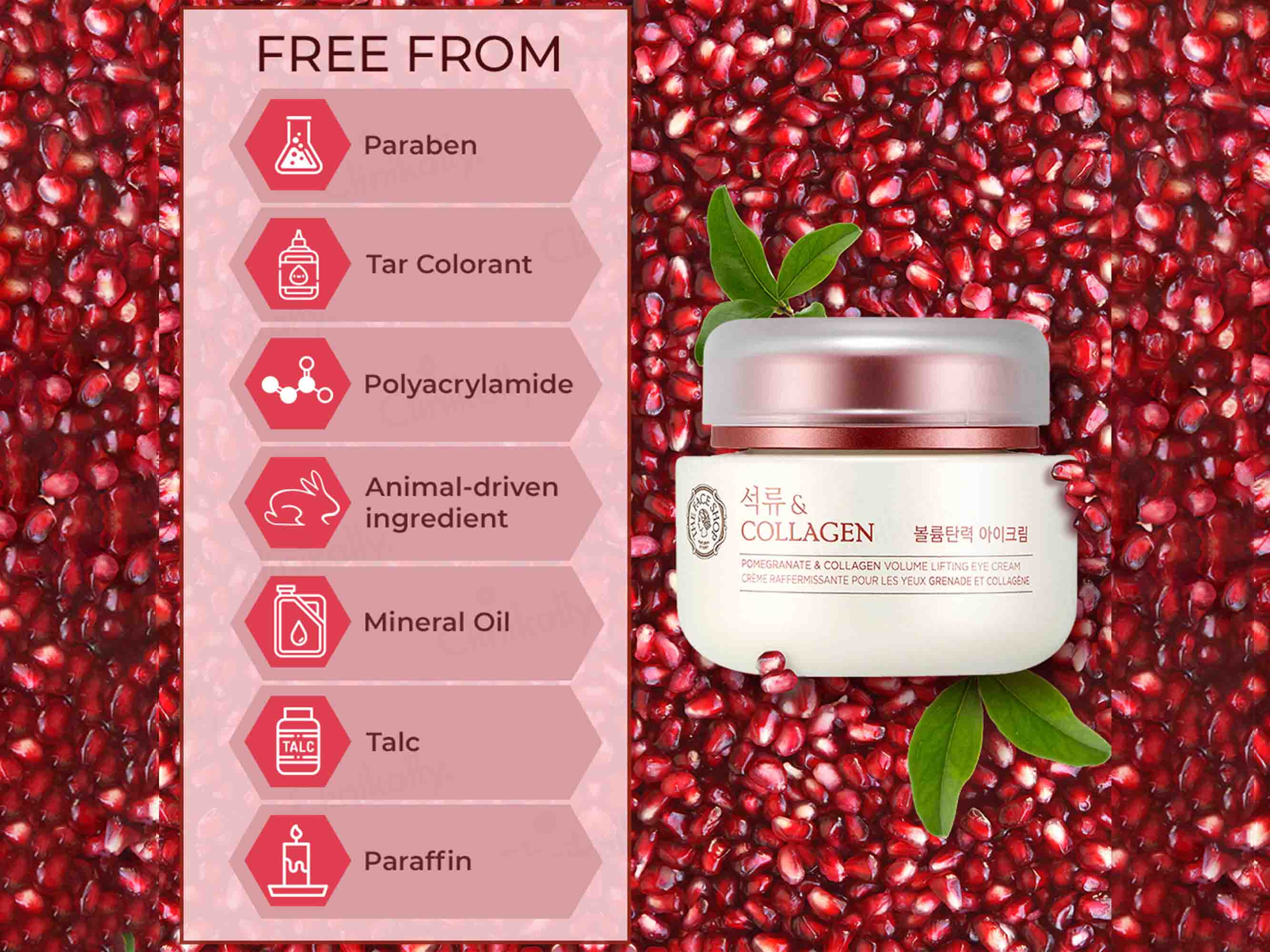 The Face Shop Pomegranate & Collagen Volume Lifting Eye Cream deeply nourishes, firms the delicate skin, and reduces the appearance of fine lines and wrinkles around the eyes.