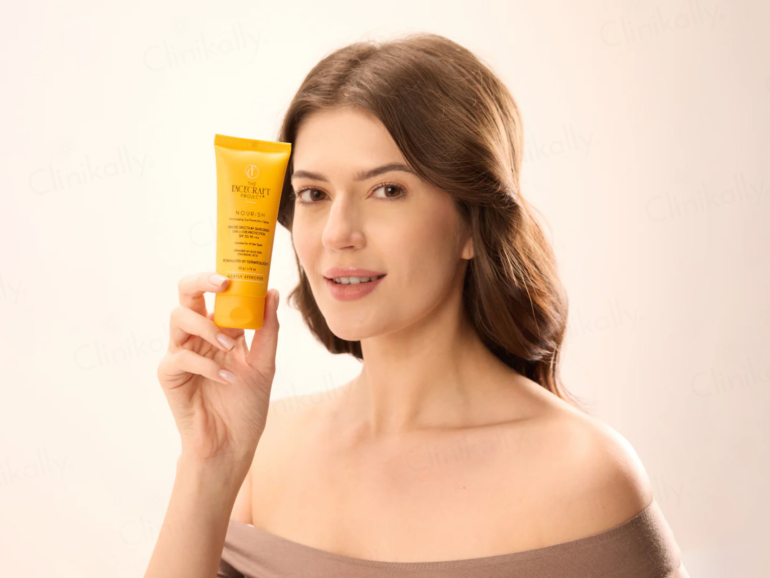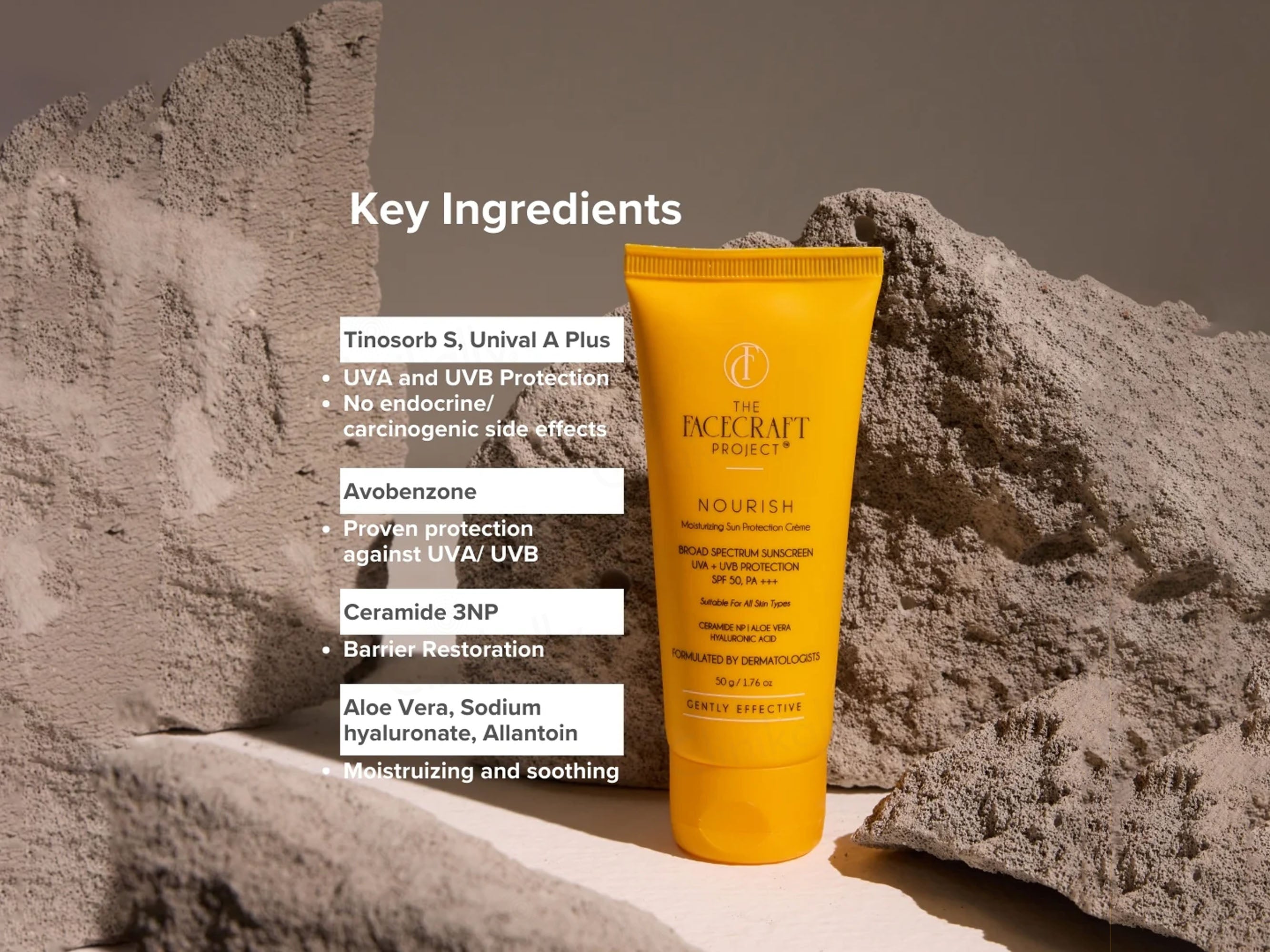The Facecraft Project Nourish Moisturizing Sun Protection Cream SPF 50 PA+++ is a broad-spectrum sunscreen with powerful SPF 50+ protection, designed to shield the skin from both UVA and UVB rays. Its lightweight, non-greasy formula hydrates and plumps the skin with Hyaluronic Acid while soothing and calming the skin with Aloe Vera Extract. The added Ceramide 3NP supports the skin's natural lipid barrier. Perfect for daily use, this sunprotection cream offers hydration, protection, and nourishment while preventing sun damage, tanning and premature aging.