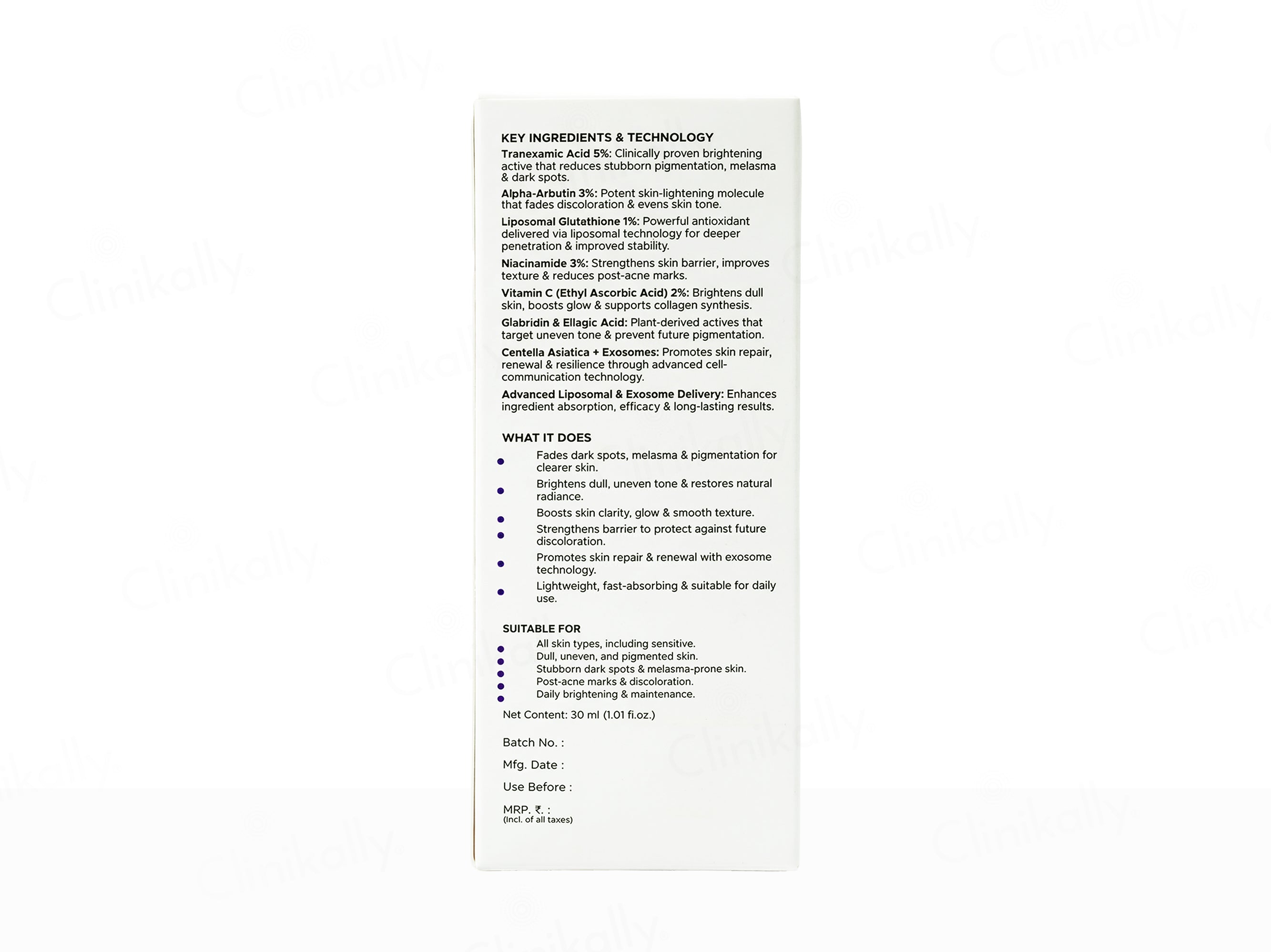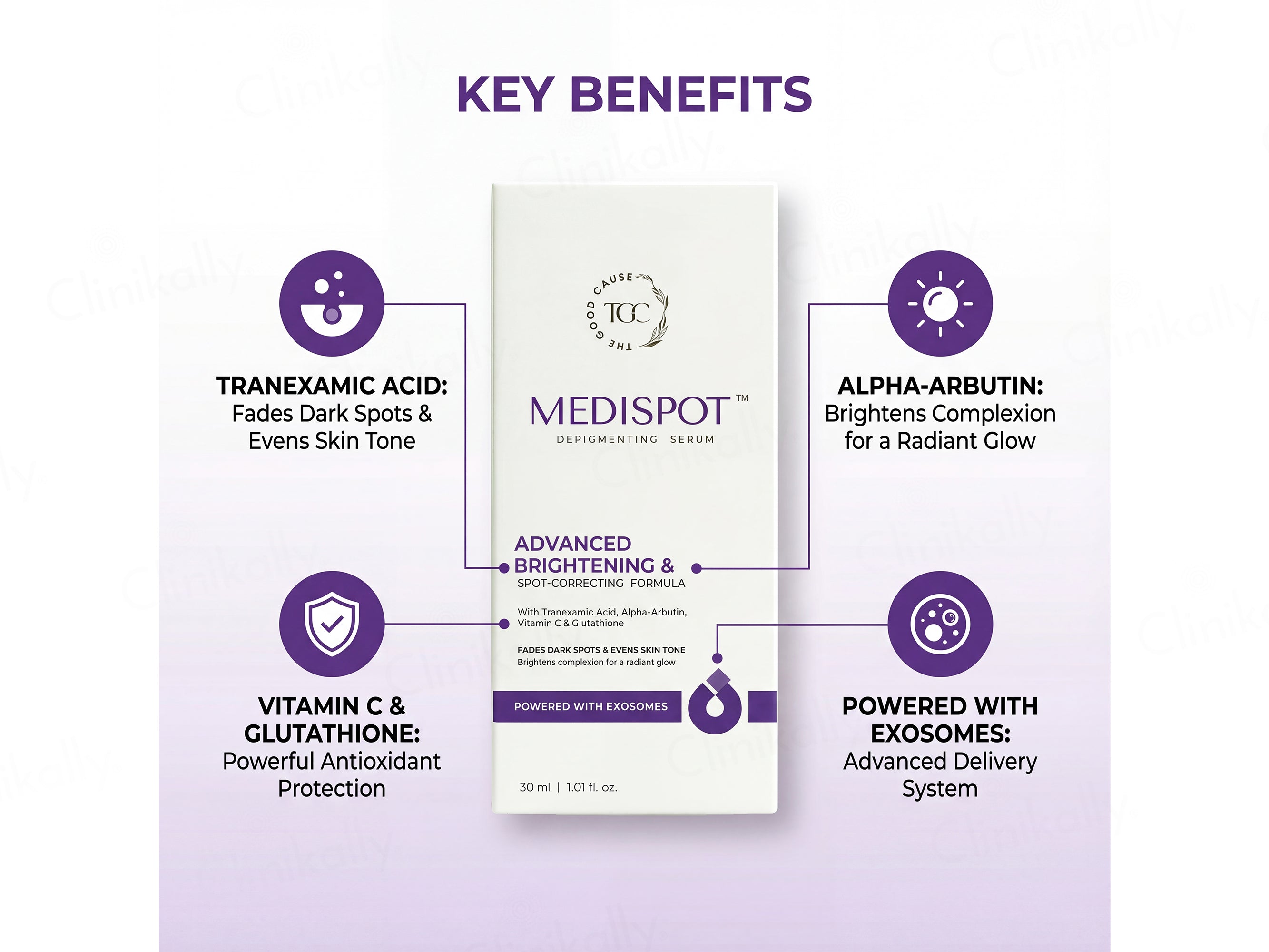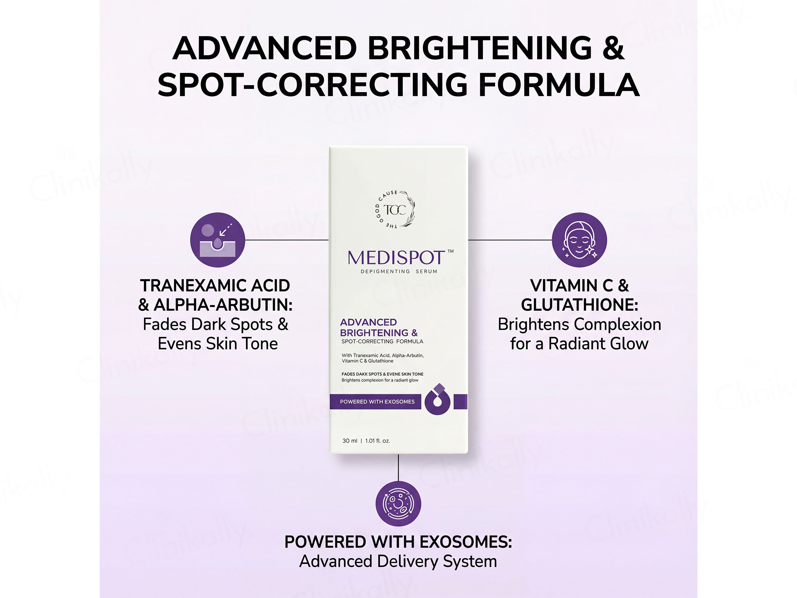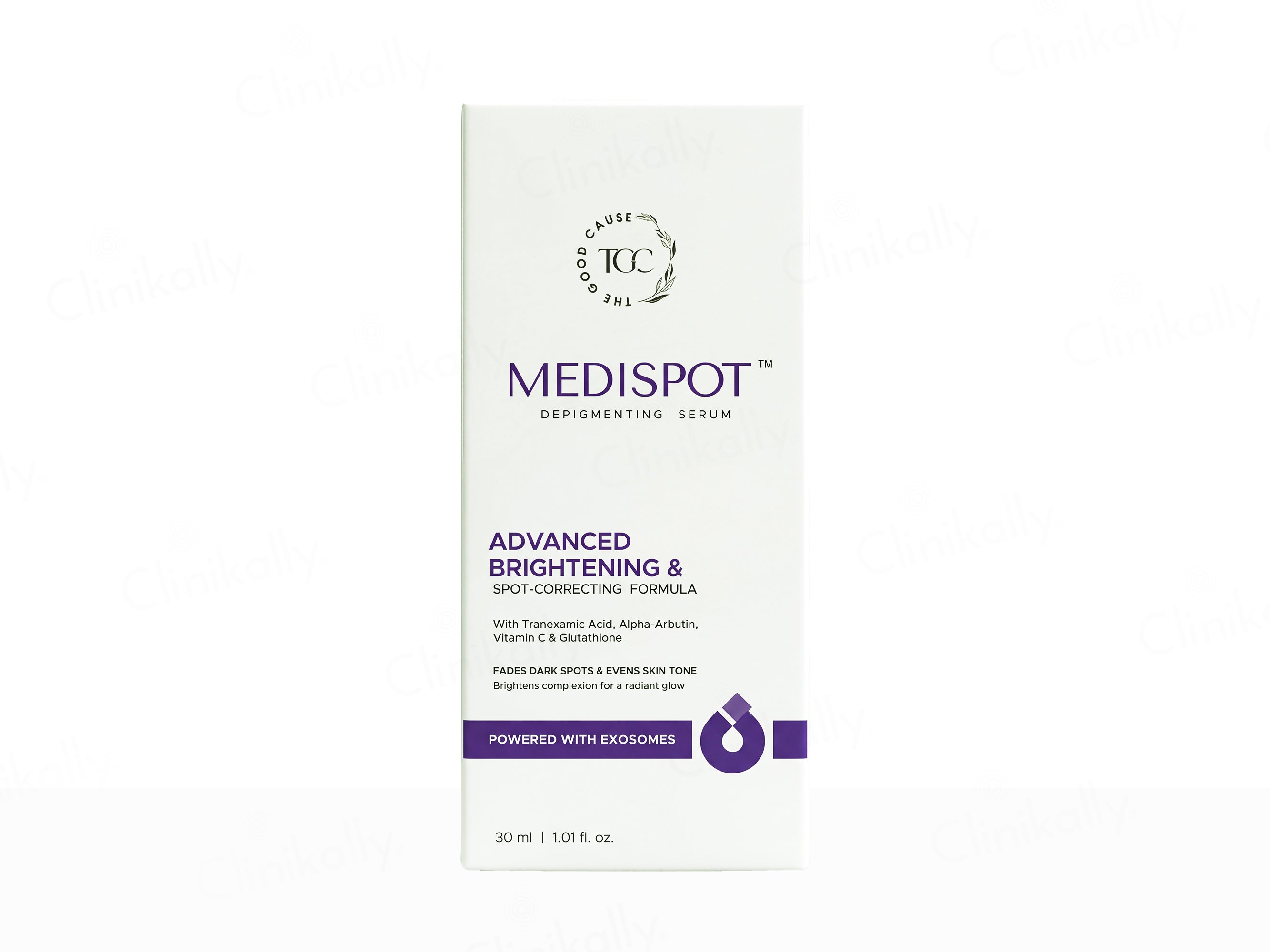 The Good Cause Medispot Advanced Brightening & Depigmenting Face Serum is a high-performance spot-correcting formula designed to visibly fade dark spots and even skin tone while enhancing overall radiance. This advanced brightening serum is powered by a potent blend of Tranexamic Acid and Alpha-Arbutin to target hyperpigmentation, complemented by Vitamin C and Glutathione to boost luminosity and antioxidant protection. The formula is further enhanced with Exosome technology to support skin renewal, along with Niacinamide and 3-O-Ethyl Ascorbic Acid to refine texture and promote a clearer complexion. Botanical actives such as Licorice Root Extract and Centella Asiatica Callus Extract help soothe skin and improve tone uniformity, while Diglucosyl Gallic Acid strengthens brightening efficacy. Suitable for nightly use, this serum helps achieve a more even, radiant, and visibly brighter complexion with consistent application.