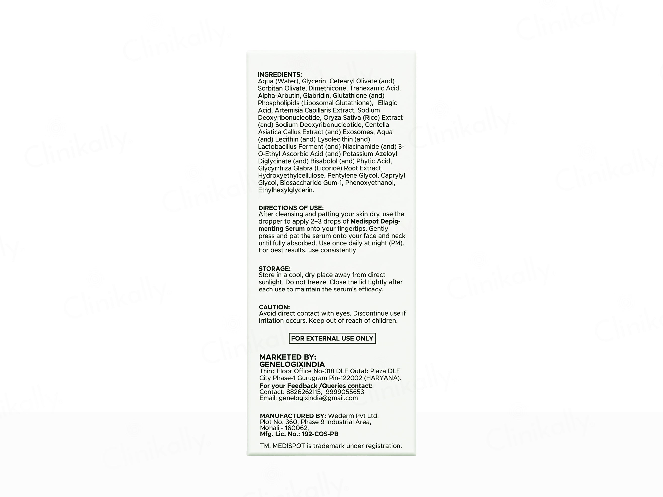 - After cleansing and drying the skin, apply 2–3 drops of The Good Cause Medispot Advanced Brightening & Depigmenting Face Serum onto fingertips, gently press and pat over face and neck until fully absorbed; use once daily at night for best results.