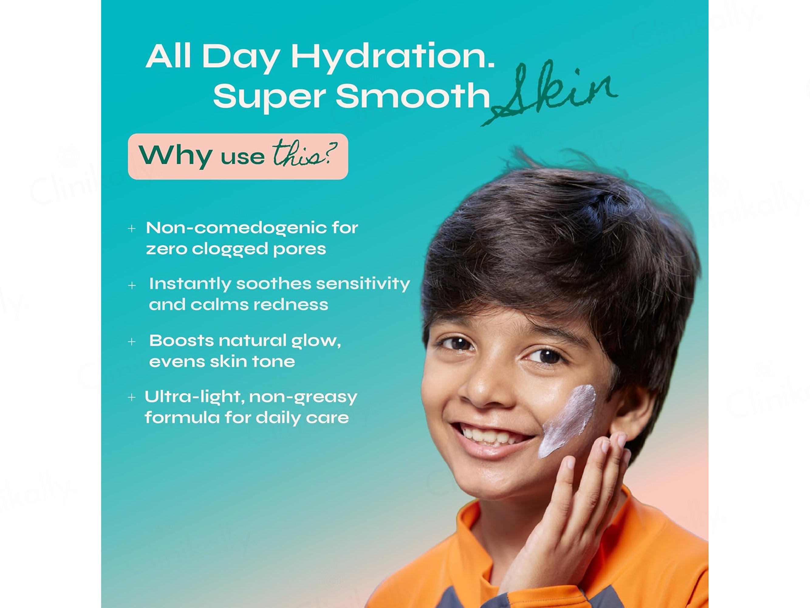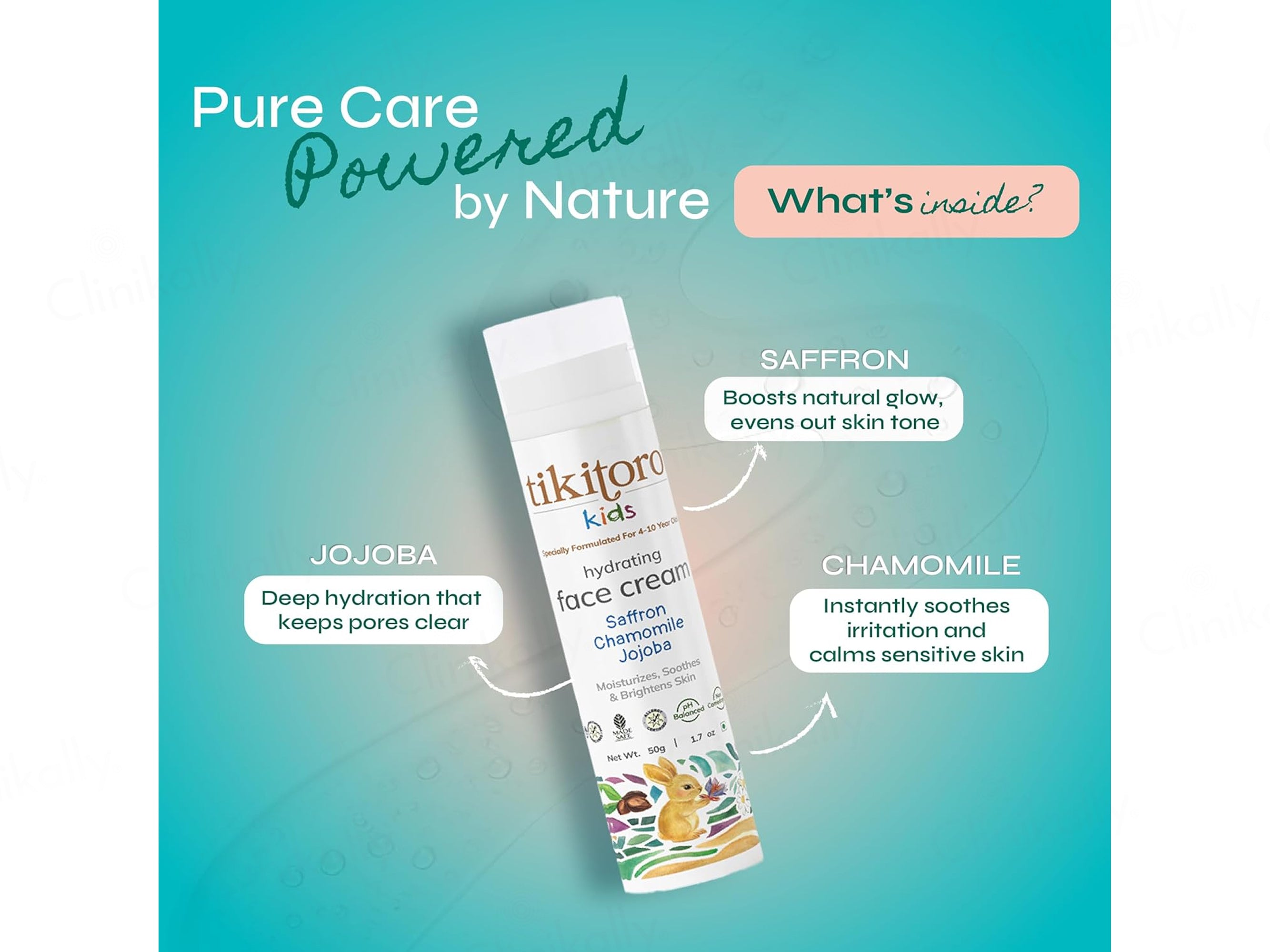 Tikitoro Kids Hydrating Face Cream is a gentle, plant-based daily moisturizer specially formulated for children aged 4–10 years to hydrate, soothe, and protect delicate young skin while enhancing its natural glow. The formula is enriched with Saffron to help brighten skin tone and boost a healthy glow, Chamomile to instantly soothe irritation and calm sensitive skin, Jojoba to provide deep hydration while keeping pores clear, and Olive to deliver long-lasting moisture that prevents dryness and keeps skin soft and supple. Crafted with mild, COSMOS-approved ingredients and free from harsh additives, this lightweight face cream absorbs easily without greasiness, helping maintain soft, smooth, and comfortable skin throughout the day. Tikitoro Kids Hydrating Face Cream is dermatologically gentle and ideal for daily morning and evening use as part of a child’s regular skincare routine.