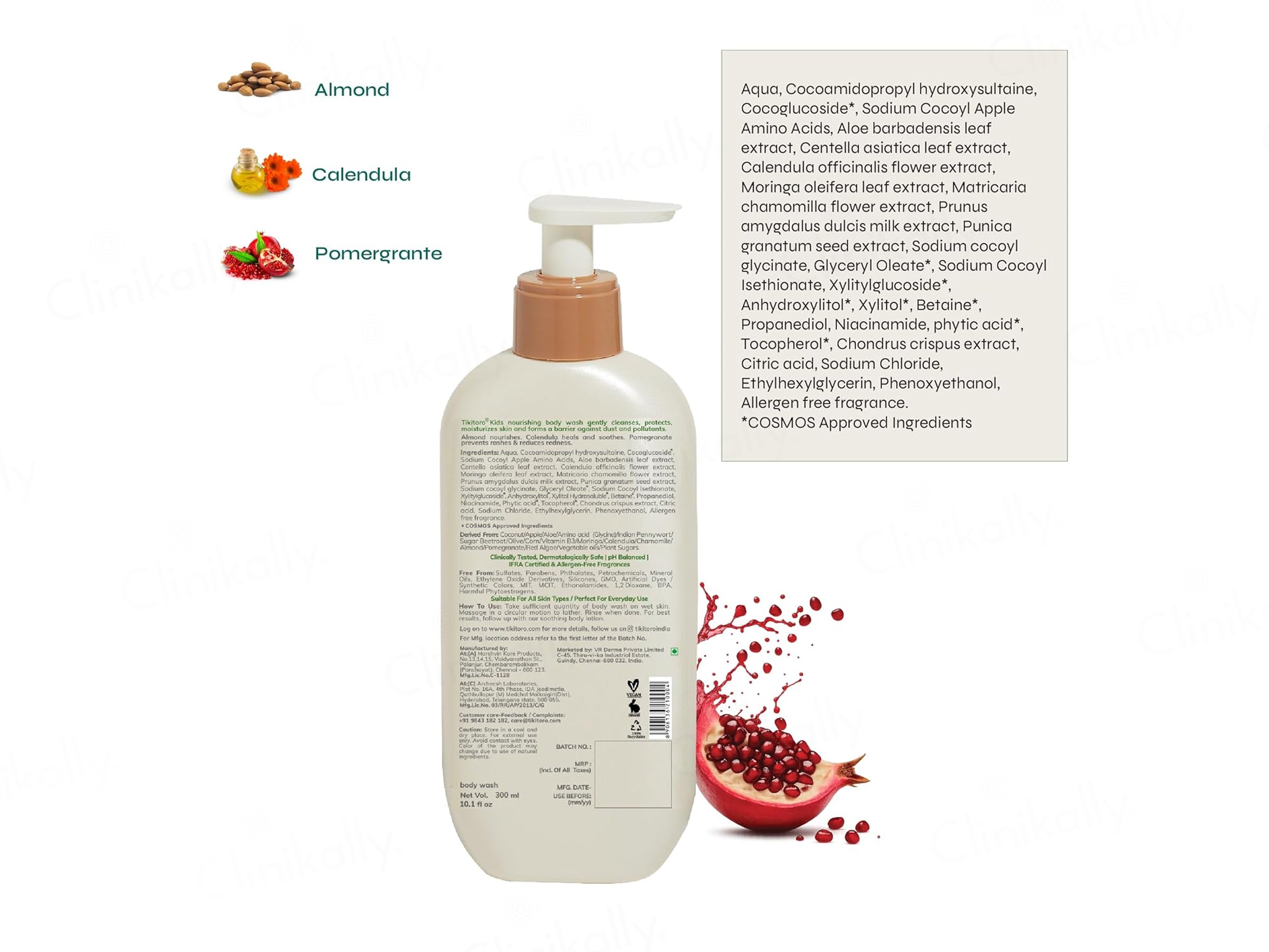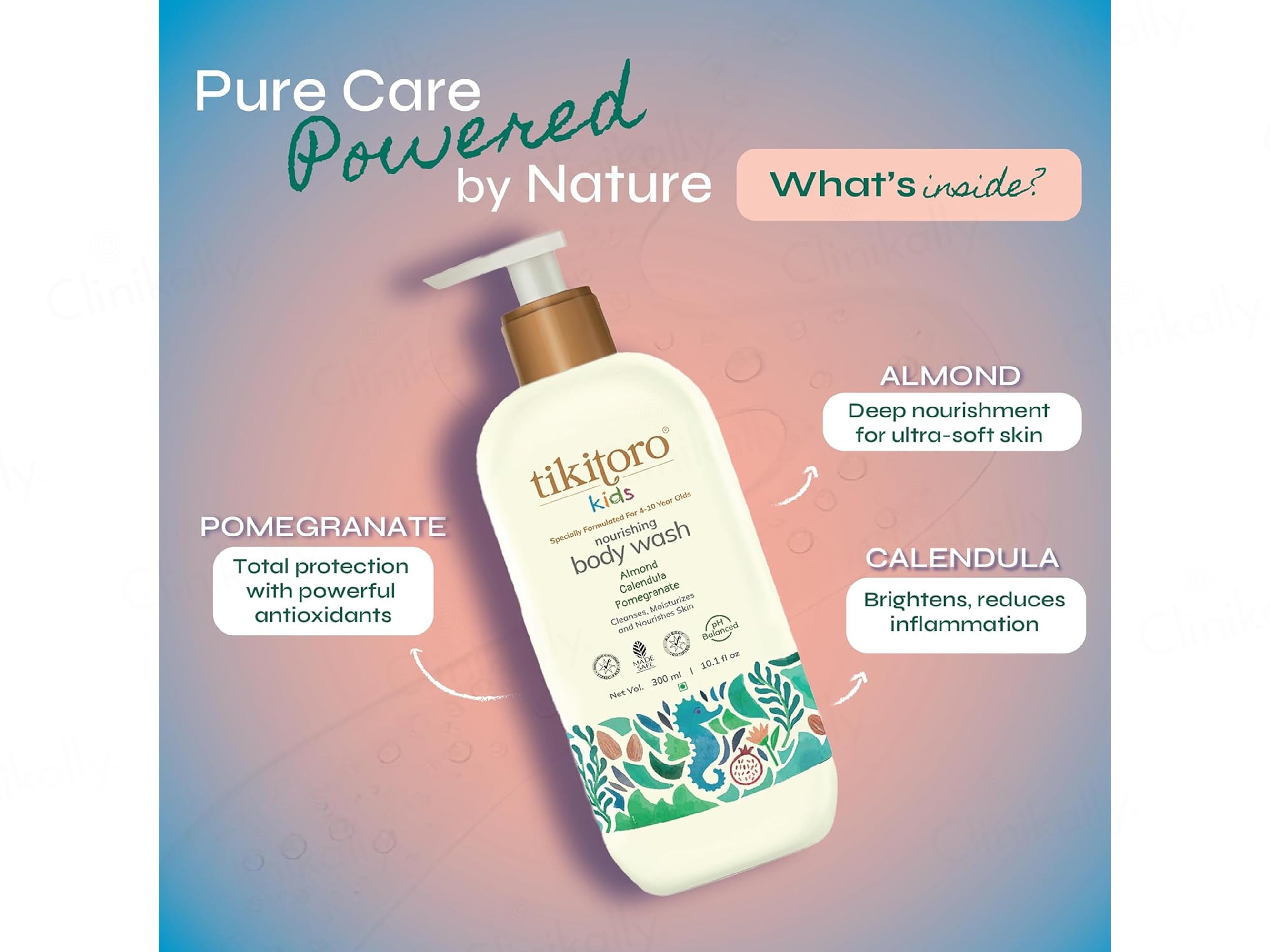 Tikitoro Kids Nourishing Body Wash is a gentle, plant-powered cleansing formula specially created for children aged 4–10 years to cleanse, nourish, and protect delicate skin while maintaining its natural moisture balance. The formulation is enriched with Almond to deeply nourish and leave skin ultra-soft, Calendula to provide instant relief from redness and irritation, Pomegranate to deliver antioxidant protection against environmental stressors, Moringa to support skin repair and defend against free-radical damage, Aloe Vera to provide complete hydration and long-lasting moisture balance, and Chamomile to soothe inflammation and support gentle skin healing. Crafted with mild cleansing agents and child-safe ingredients, this nourishing body wash cleanses without stripping natural oils, leaving skin feeling soft, calm, and refreshed after every bath. Tikitoro Kids Nourishing Body Wash is dermatologically gentle, free from harsh additives, and ideal for regular daily use as part of a child’s healthy bathing routine.