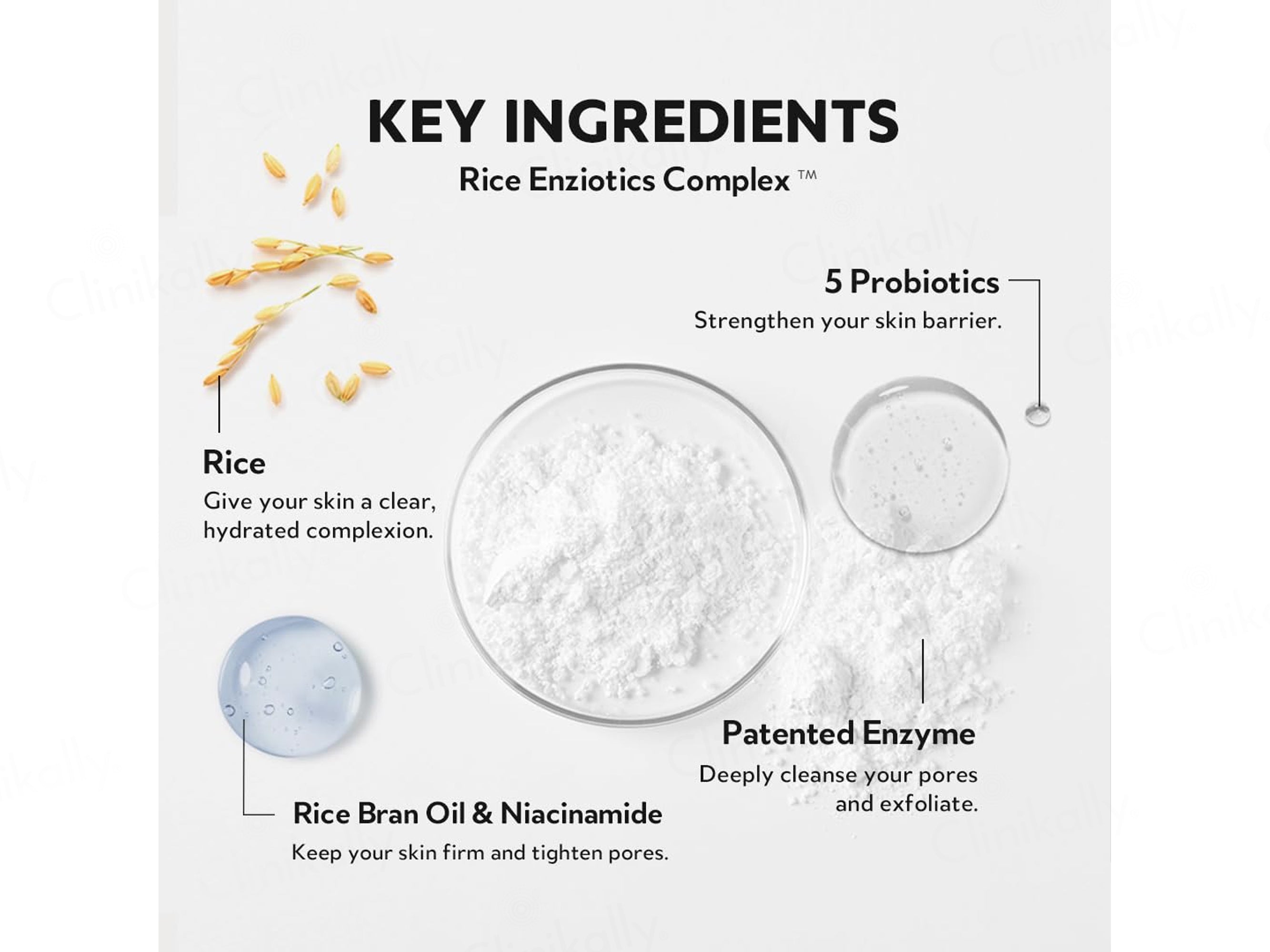The key ingredients include Rice Enziotics Complex™, Patented Enzyme, Rice Bran Oil, Niacinamide, 5 Probiotics, and Rice Extract.