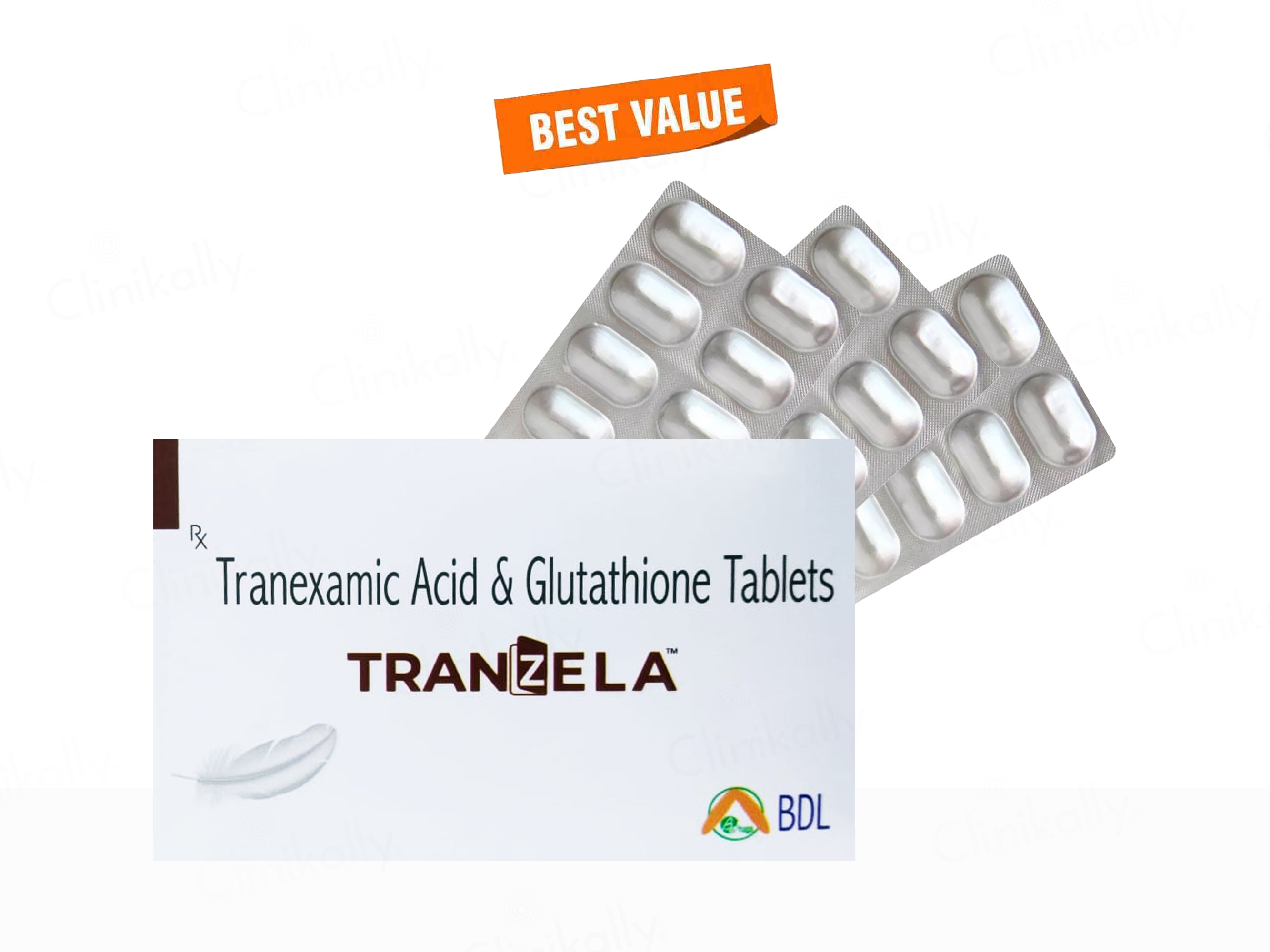 Tranzela Tablet is a prescription combination used to treat melasma and hyperpigmentation. Tranexamic acid reduces melanin synthesis by inhibiting plasminogen activation in skin cells, while glutathione provides antioxidant action, lightens skin, and reduces oxidative stress. Together, they help improve skin tone, reduce pigmentation, and promote a brighter complexion.
