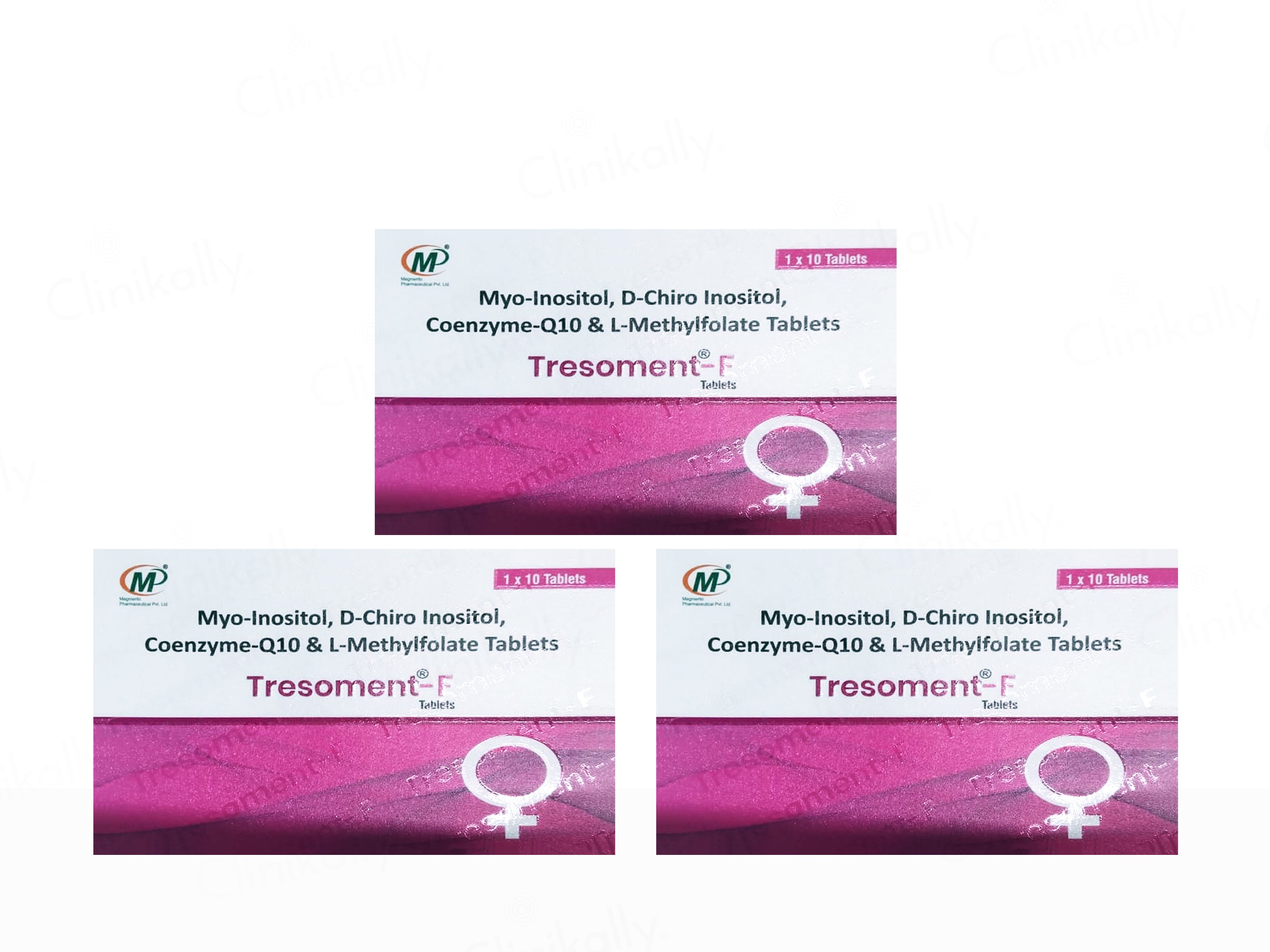 Tresoment-F Tablet is a nutritional supplement formulated for women's reproductive health, particularly to support management of polycystic ovary syndrome (PCOS) and improve fertility outcomes with a balanced blend of insulin-sensitizing and antioxidant nutrients. This advanced formula features Myo-Inositol and D-Chiro Inositol in an optimal ratio to enhance insulin sensitivity and ovarian function, Coenzyme-Q10 for energy support and egg quality improvement, and L-Methylfolate as the active form of folate for hormonal balance and fetal development support, helping regulate menstrual cycles, reduce PCOS symptoms like irregular periods and hirsutism, and promote ovulation when used consistently under medical guidance.