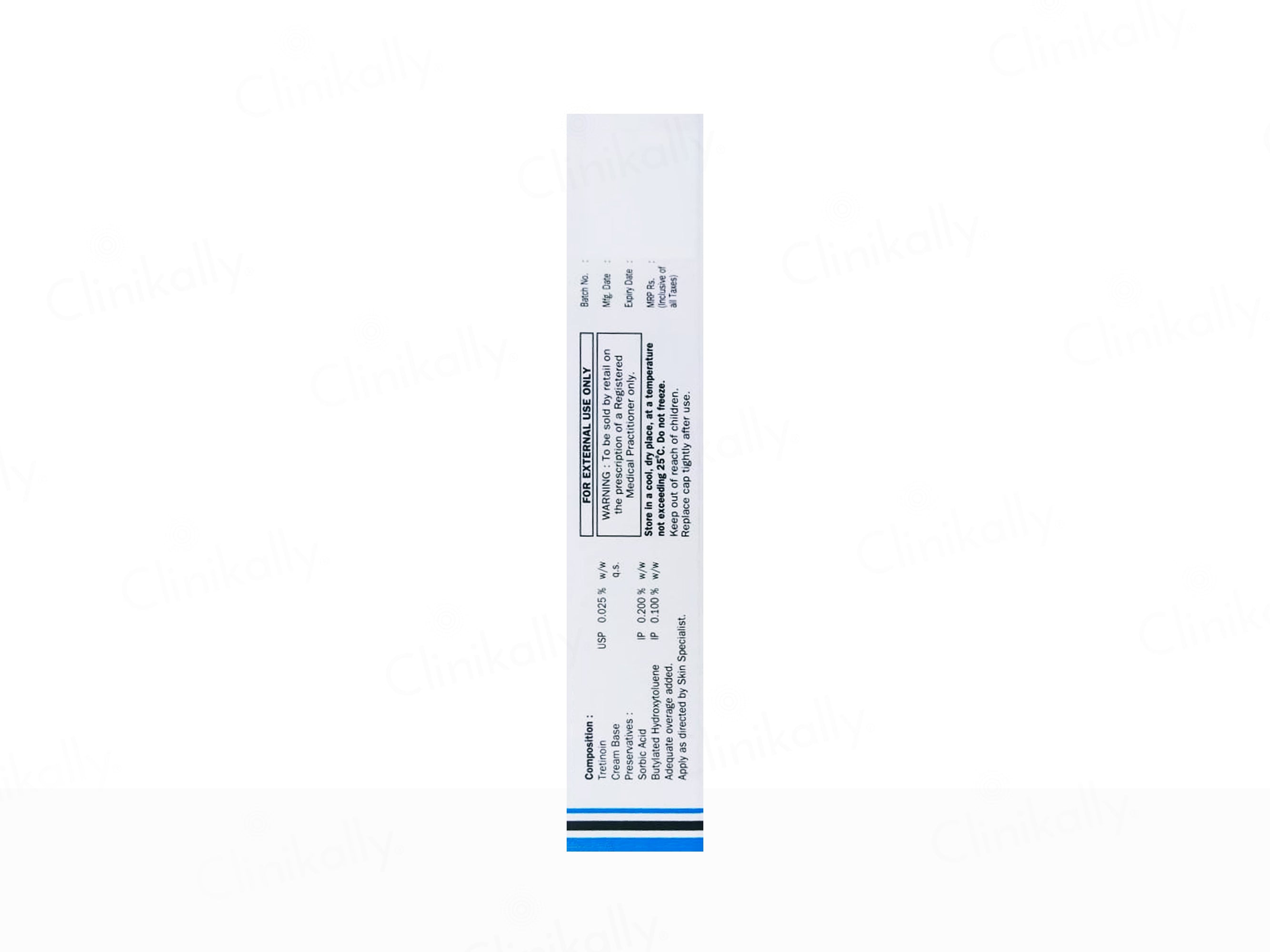 Tretin 0.025% Cream contains Tretinoin (0.025% w/w), a topical retinoid widely used for the treatment of acne, pimples, dark spots, and signs of aging. It works by increasing skin cell turnover, preventing clogged pores, reducing acne formation, and improving overall skin texture. It also helps lighten pigmentation and reduce fine lines over time. This cream should be used exactly as directed, as it can cause irritation if overused.