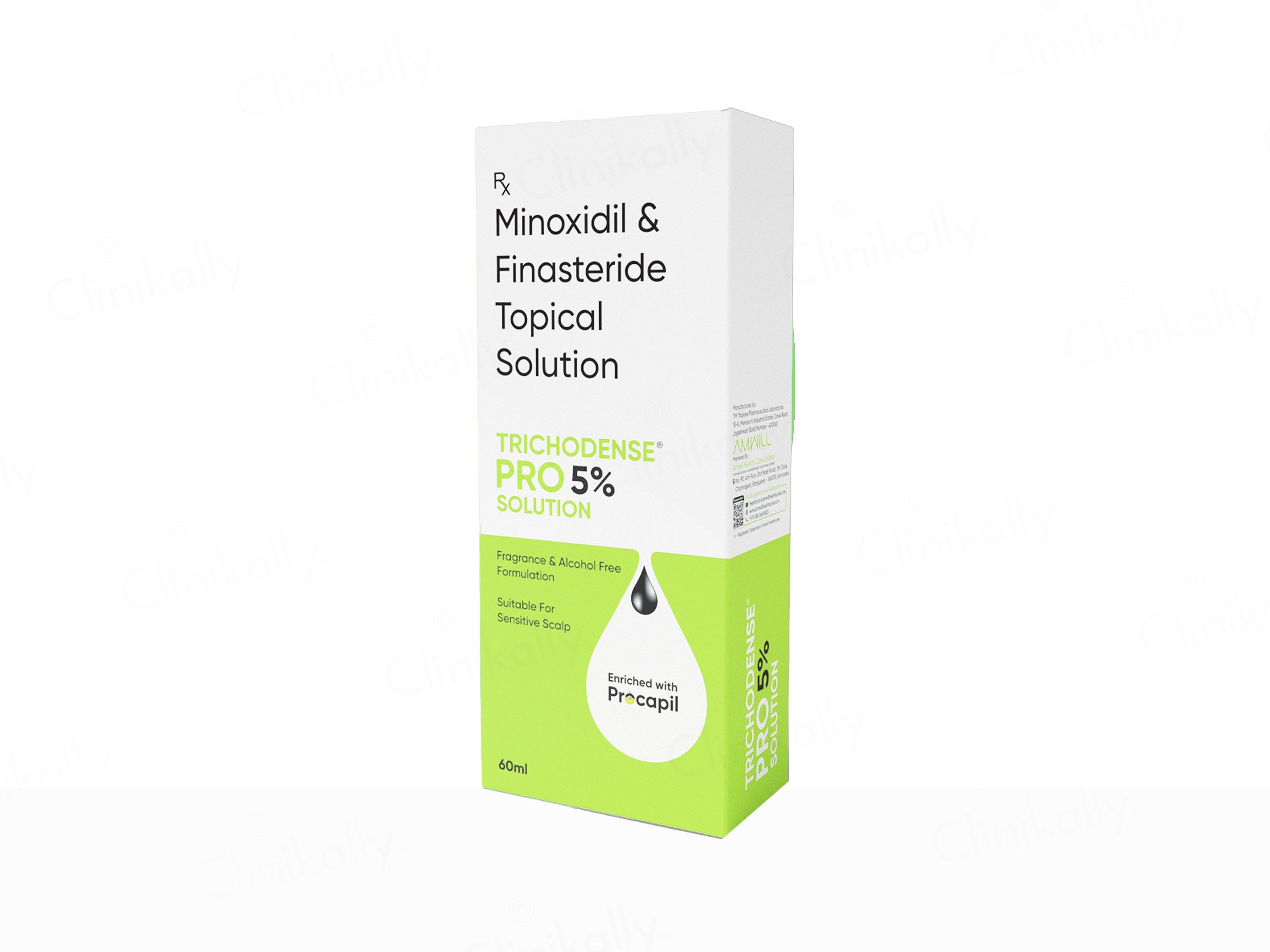 Trichodense Pro 5% Topical Solution is a trusted remedy for hair loss and baldness. Featuring Minoxidil and Finasteride, & enriched with Procapil, It is commonly used to treat hair loss, particularly in cases of male pattern baldness. This easy-to-apply solution revitalizes hair follicles, increasing hair density and thickness. Trichodense Pro 5% Topical Solution is a reliable choice for regaining a fuller, more youthful head of hair and boosting self-confidence.