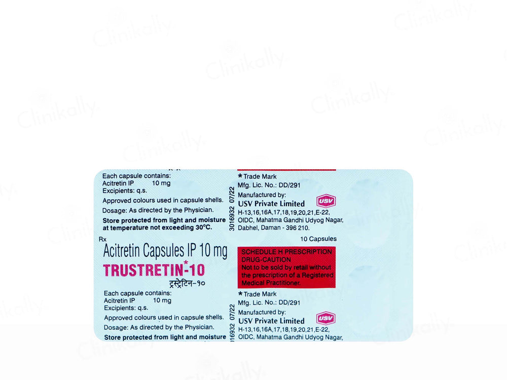 Trustretin-10 Capsule is a prescription Acitretin Capsules IP 10 mg formulation designed for dermatological management under medical supervision. This oral retinoid therapy is widely used by dermatologists for chronic skin conditions, making it a trusted option in advanced psoriasis treatment and keratinization disorders. Trustretin-10 works by regulating skin cell growth, helping improve scaling, redness, and plaque formation over time. It should be taken strictly as directed by a physician. Ideal for patients seeking clinically proven retinoid capsules for long-term skin care management solutions.