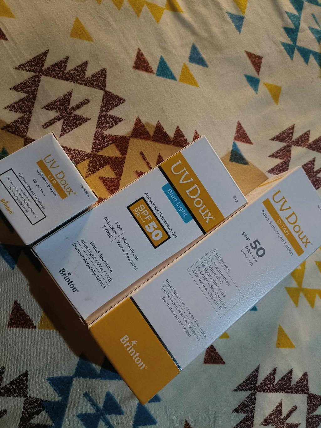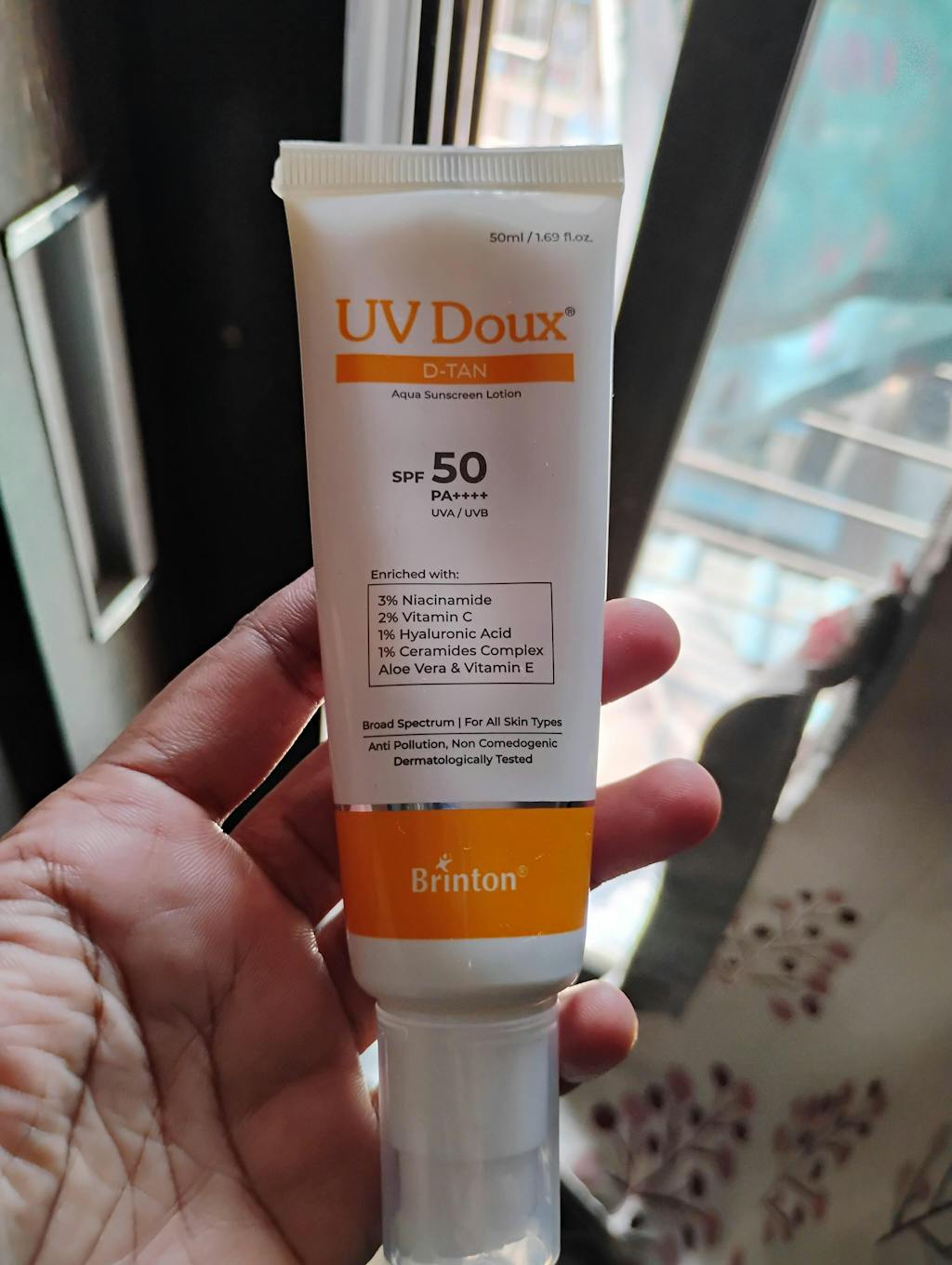 UV Doux D-Tan Aqua Sunscreen Lotion SPF 50 PA++++ is a hydrating sunscreen that provides superior broad-spectrum protection against UVA and UVB rays while reducing tan and preventing sun damage. Its lightweight, water-based formula absorbs quickly, leaving no greasy residue or white cast. Enriched with skin-soothing and nourishing ingredients like Niacinamide, Vitamin C, Hyaluronic Acid and Ceramides, it maintains hydration and promotes an even skin tone. Ideal for daily use, with the goodness of Vitamin E and Aloe Vera, UV Doux D-Tan Aqua Sunscreen Lotion is suitable for all skin types.