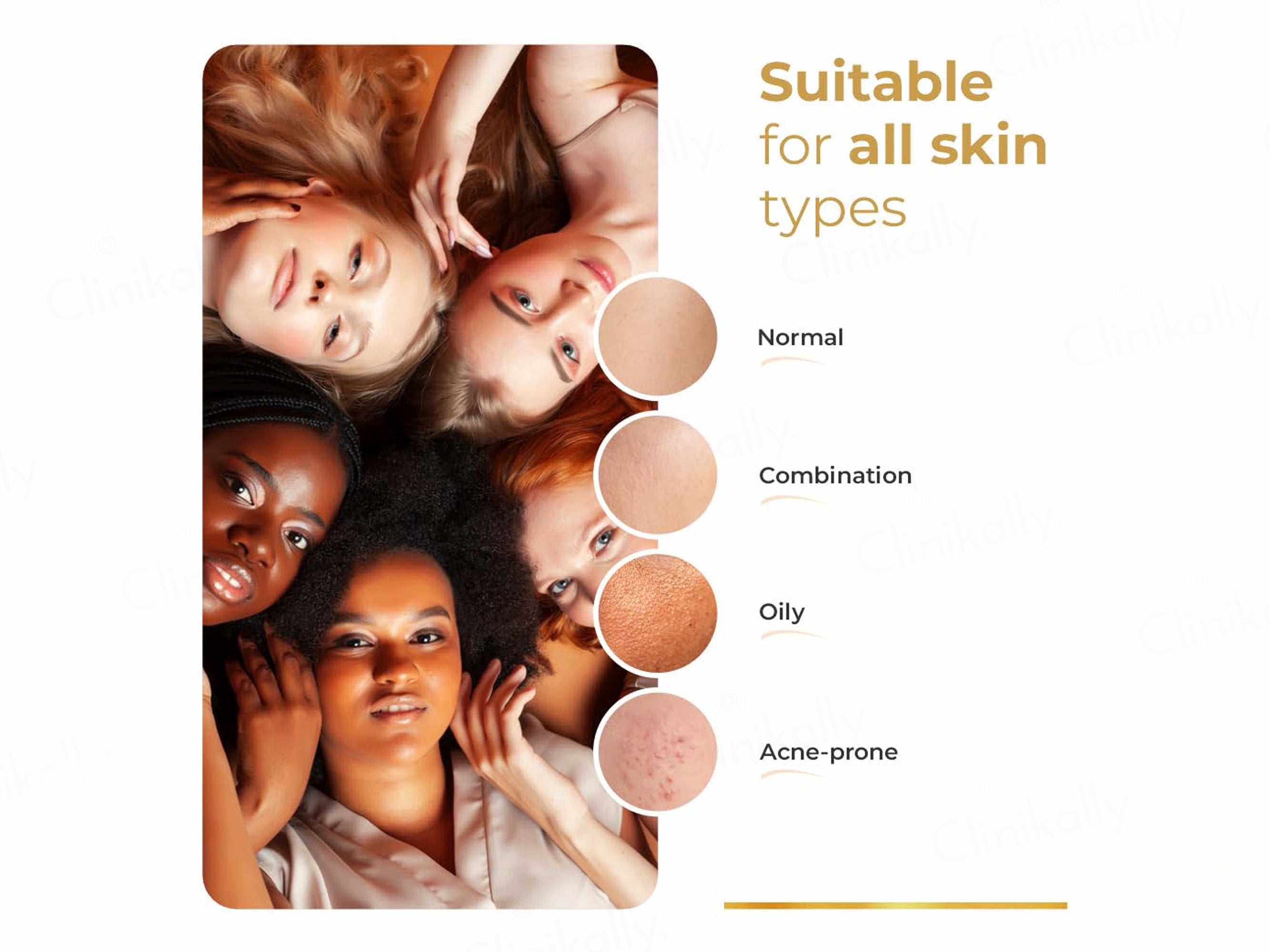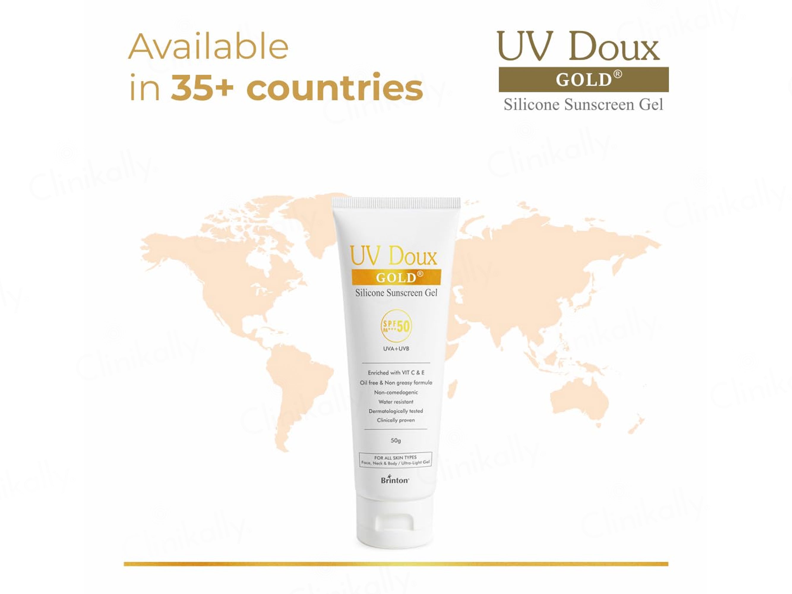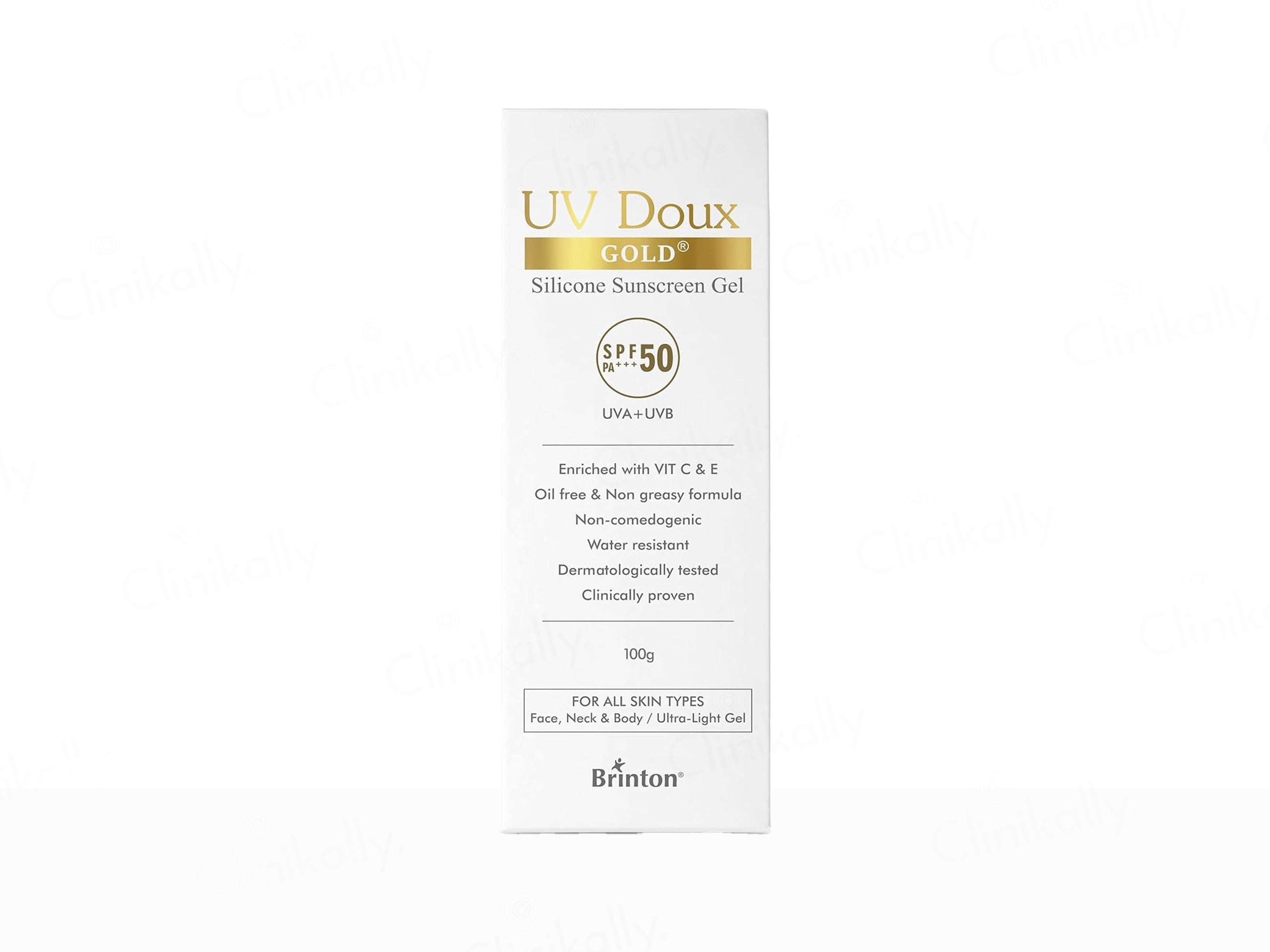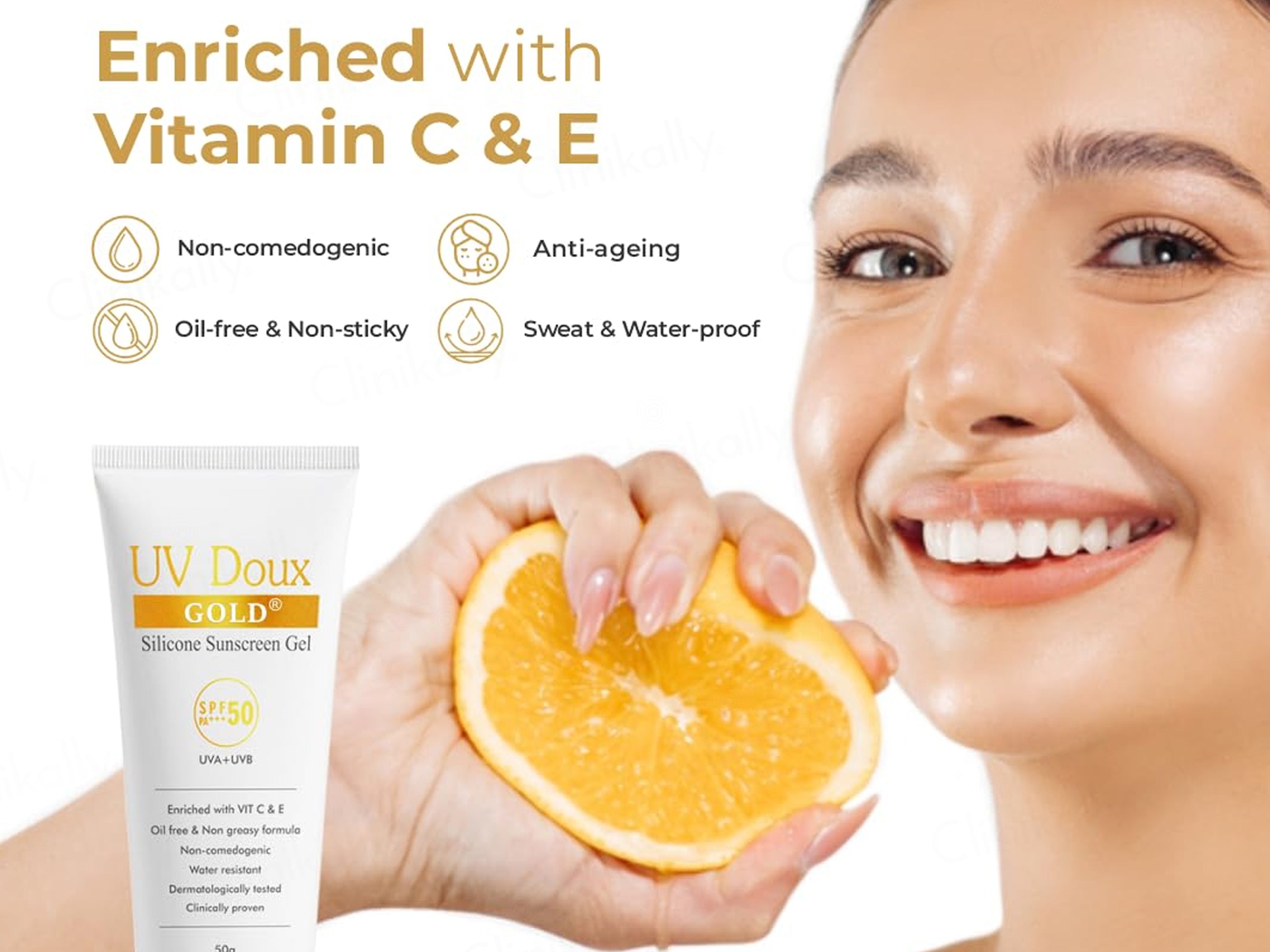 UV Doux Gold Silicone Sunscreen Gel SPF 50 PA+++ is a broad-spectrum facial sunscreen with silicone-based protection, designed for oily, acne-prone, and blemish-prone skin to prevent melasma and premature photoaging. This oil-free, non-greasy, non-comedogenic gel formula is enriched with Vitamin C and Vitamin E for antioxidant defense and anti-aging benefits, while providing sweat and water resistance for up to 80 minutes of active use. It has lightweight application and superior UV blocking. Dermatologically tested and suitable for all skin types, it ensures even coverage on face, neck, and body without white cast or heaviness.