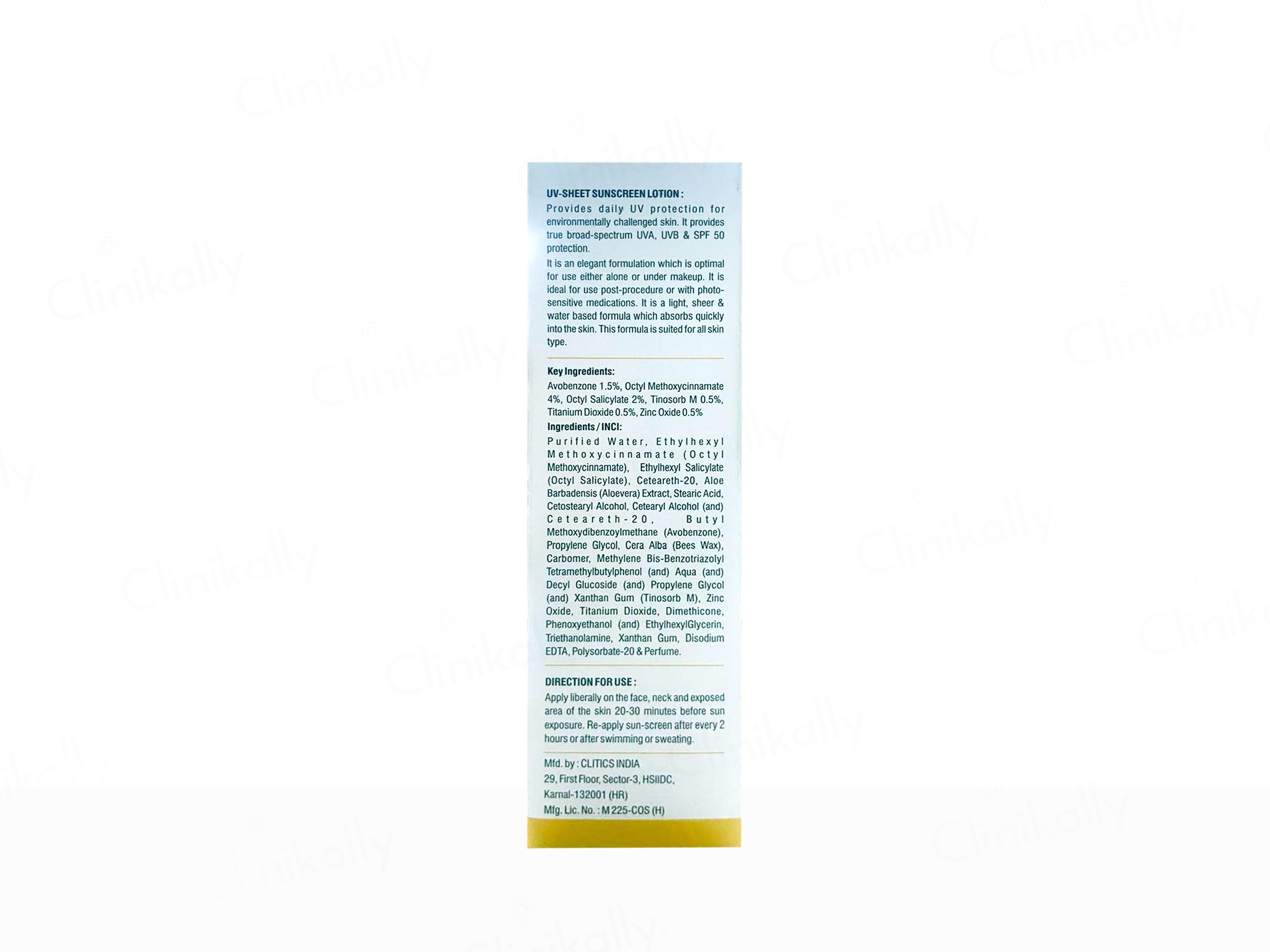 UV Sheet Sunscreen Lotion SPF 50+ PA+++ is a high-protection sunscreen lotion designed to safeguard your skin from harmful UVA and UVB rays. This lightweight, non-greasy formula provides a smooth, matte finish, making it ideal for daily use. Enriched with moisturizing and soothing ingredients like Aloe Vera, Hyaluronic Acid, and Vitamin E, it keeps your skin hydrated and comfortable throughout the day. Suitable for all skin types, UV Sheet Sunscreen Lotion ensures your skin stays protected, hydrated, and shine-free.