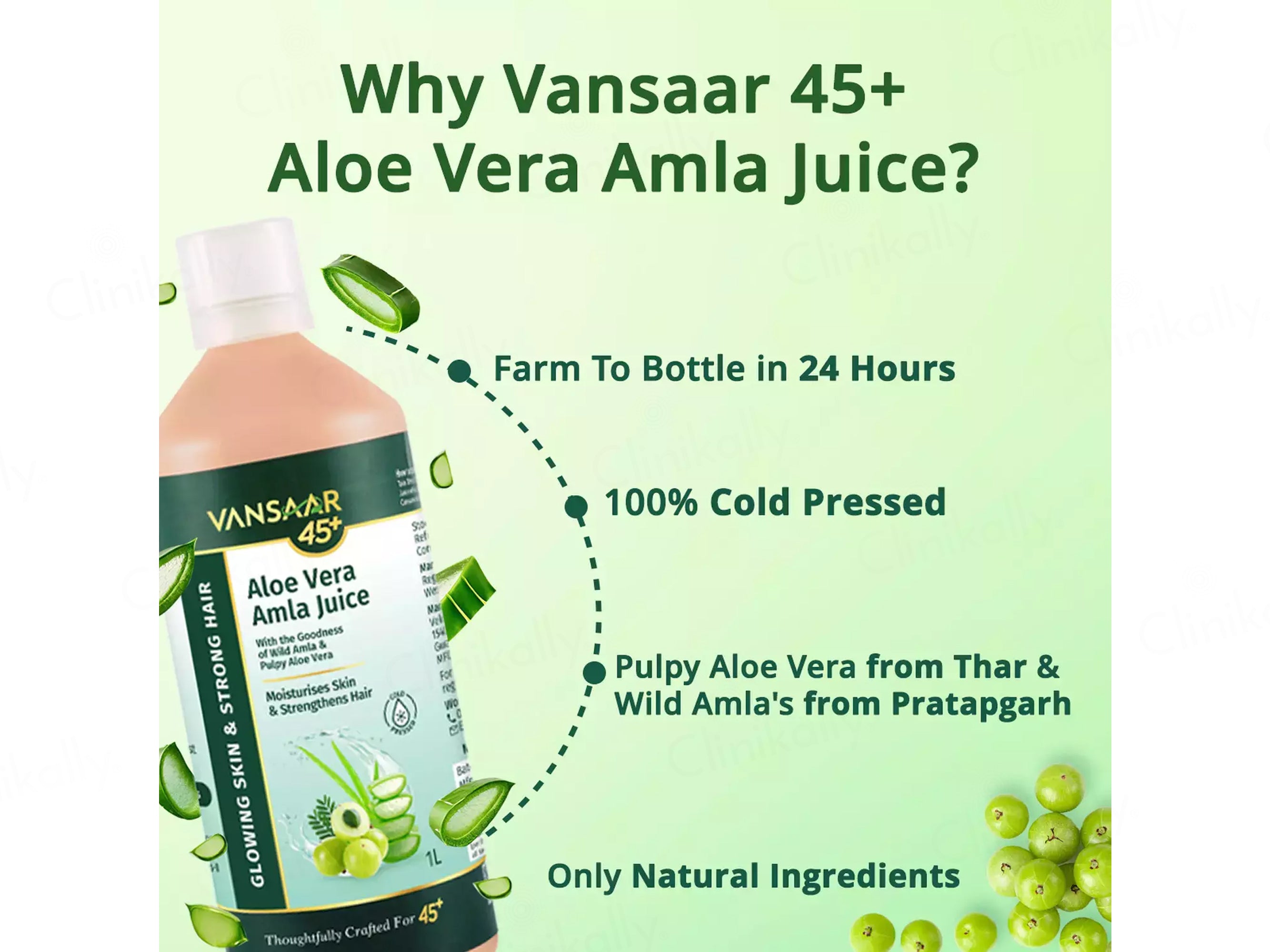 - Mix 30ml of Vansaar 45+ Aloe Vera Amla Supplement Juice with water and consume twice daily for best results.
