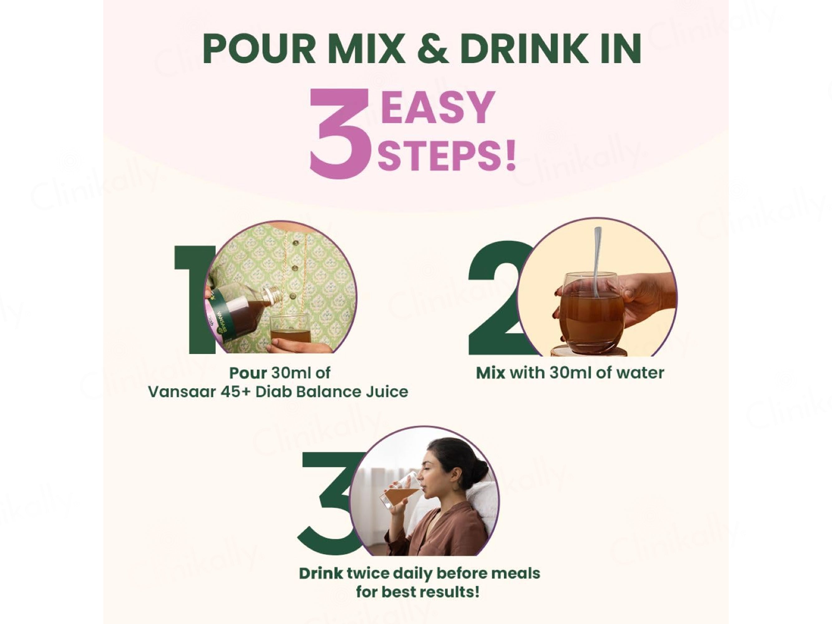 - Mix 30ml of Vansaar 45+ Diab Balance Supplement Juice in a glass of water and consume twice daily; take the morning dose on an empty stomach for best results.