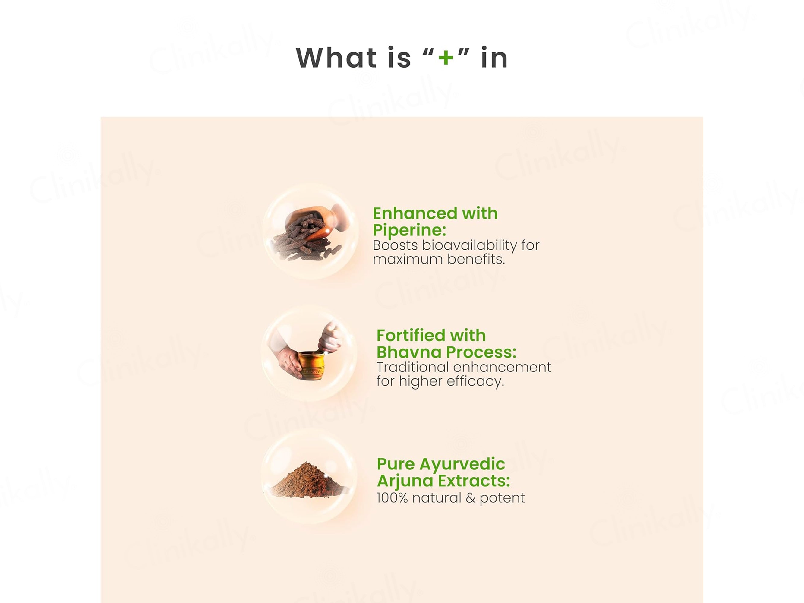 Vedistry Arjuna+ Ayurvedic Tablet is a potent Ayurvedic supplement designed to strengthen heart health and promote cardiovascular wellness, featuring standardized Arjuna extract enriched with Pippali for enhanced bioavailability through the traditional Bhavana process. Each tablet delivers key ingredients including Arjuna extract (bark) (Terminalia arjuna) (10% Tannins 50mg) for cardioprotective support, Arjuna powder (bark) (Terminalia arjuna) potentiated by the Bhavana process to boost efficacy, and Black Pepper extract (fruit) (Piper longum) (5% Piperine) to improve absorption of herbal compounds. This formulation helps fortify heart muscles, improve circulation, manage healthy cholesterol and blood pressure levels, reduce oxidative stress, calm daily stress, enhance stamina, and support steady heart rhythm for overall vitality and endurance.