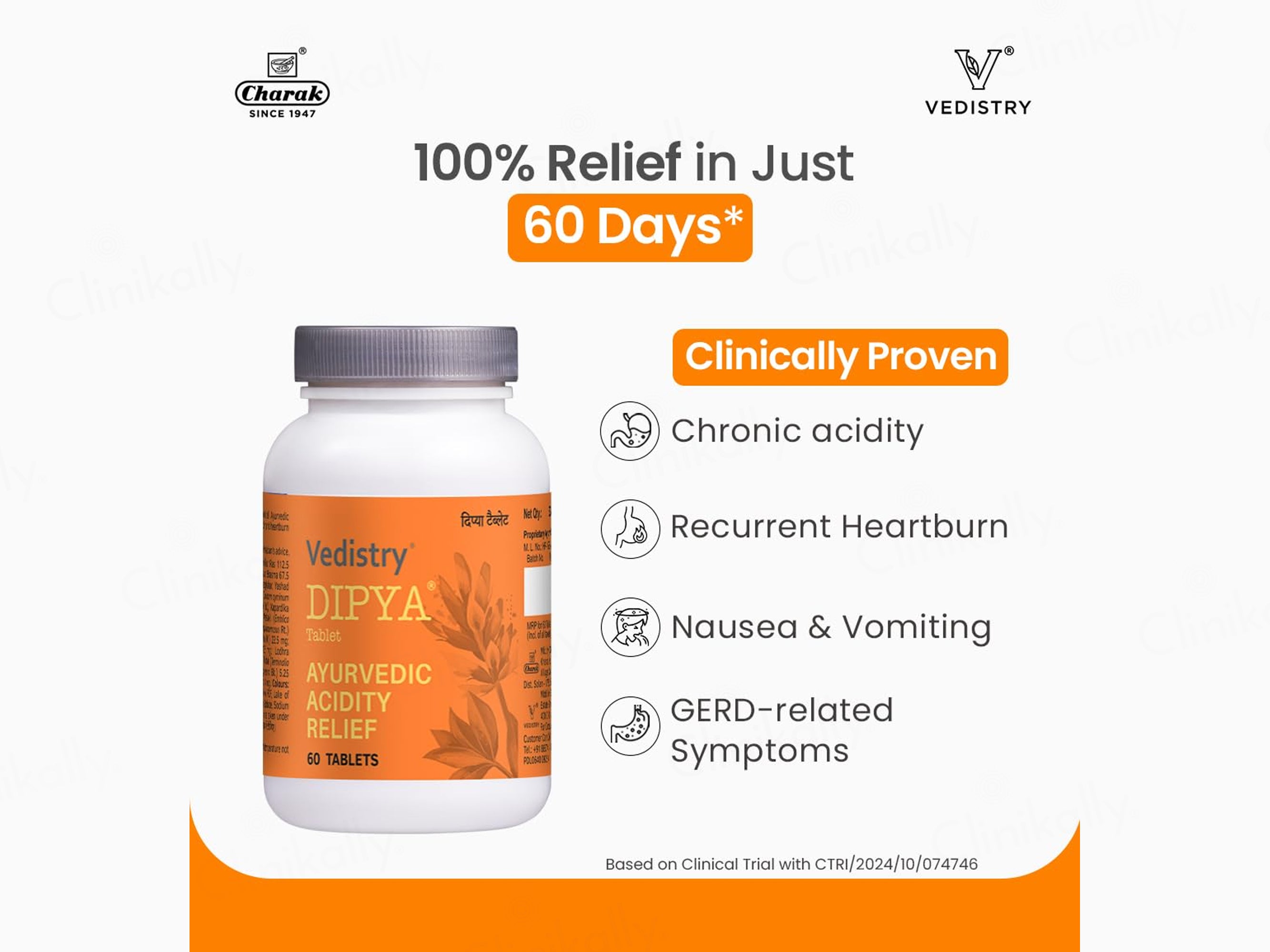 Vedistry Dipya Ayurvedic Acidity Relief Tablet is a clinically tested, natural supplement designed to alleviate acidity for all adults. Crafted with powerful Ayurvedic ingredients like yashtimadhu, usheer, jeerak, and lodhra, this gentle formula neutralizes excess acid, relieves heartburn, and promotes digestive health. Ideal for daily use, it offers a holistic solution rooted in Ayurveda to restore digestive balance, soothe the gut lining, and regulate acid secretion for lasting relief over time.