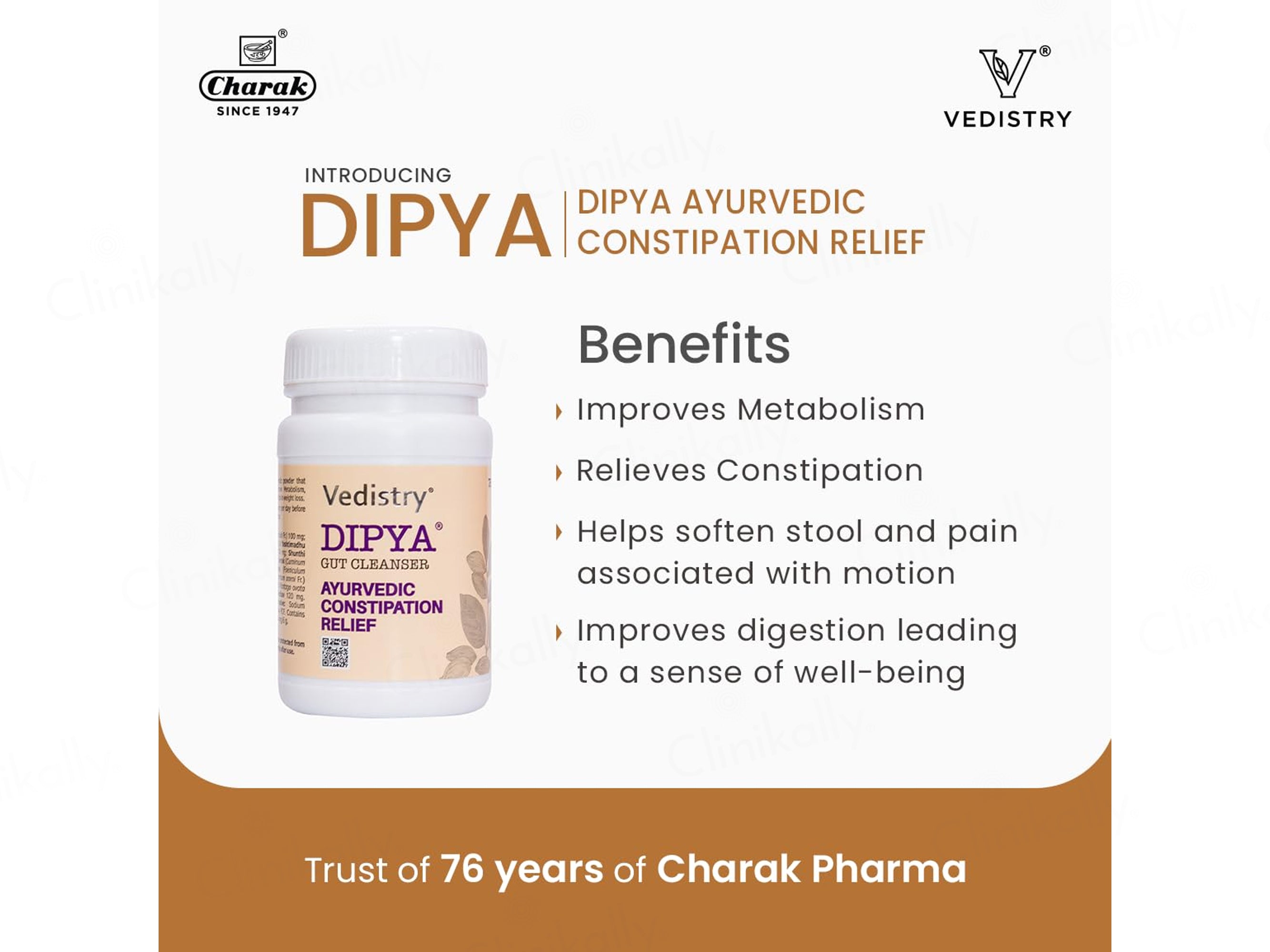 Vedistry Dipya Gut Cleanser Ayurvedic Constipation Relief Powder is a 100% natural Ayurvedic laxative formulated to gently relieve constipation, soften stools, reduce bloating, and restore healthy bowel movements without causing cramps or dependency. This high-fiber gut cleanser combines time-tested herbs to detoxify the digestive tract, promote natural peristalsis, improve appetite, and enhance overall gut health for long-lasting comfort and well-being. Enriched with powerful Ayurvedic ingredients like Amalaki, Haritaki, Isabgol, Yashtimadhu, Shunthi, and Jeerak, it works synergistically to cleanse the intestines, soothe inflammation, and support regular, effortless elimination when taken before bedtime.