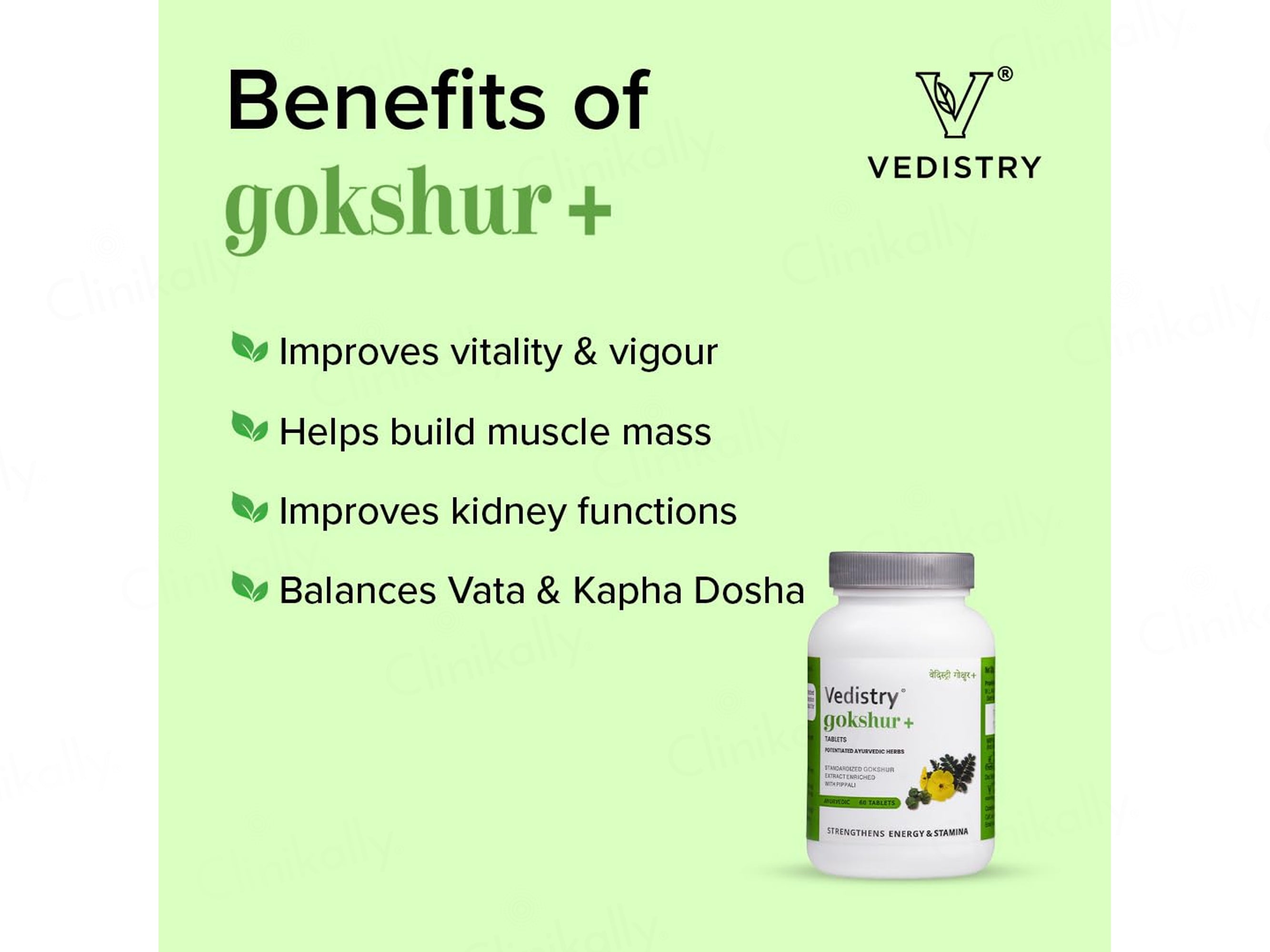 Vedistry Gokshur+ Ayurvedic Tablet is a potent herbal supplement formulated with standardized Gokshur extract enriched with Pippali to boost strength, stamina, vitality, and overall physical performance while supporting healthy kidney function and muscle mass development. Gokshur works as a natural rejuvenator that improves vigour, enhances physical endurance, and promotes muscle-building capacity, while Pippali helps improve nutrient absorption, balances Vata and Kapha dosha, and supports metabolic function, making the blend effective for reducing fatigue and improving daily energy levels. Together, these Ayurvedic actives strengthen the body, help maintain urinary health, and support long-term wellness, making it ideal for individuals seeking natural stamina enhancement and improved vitality.