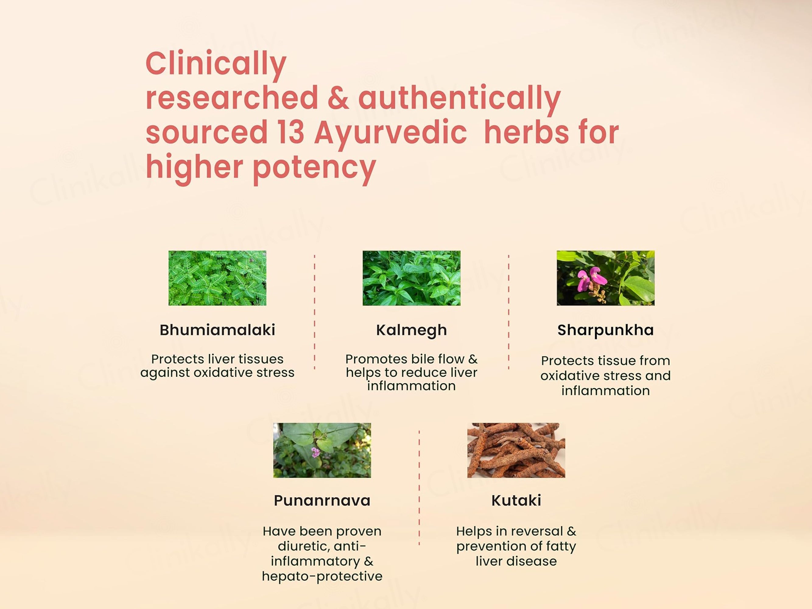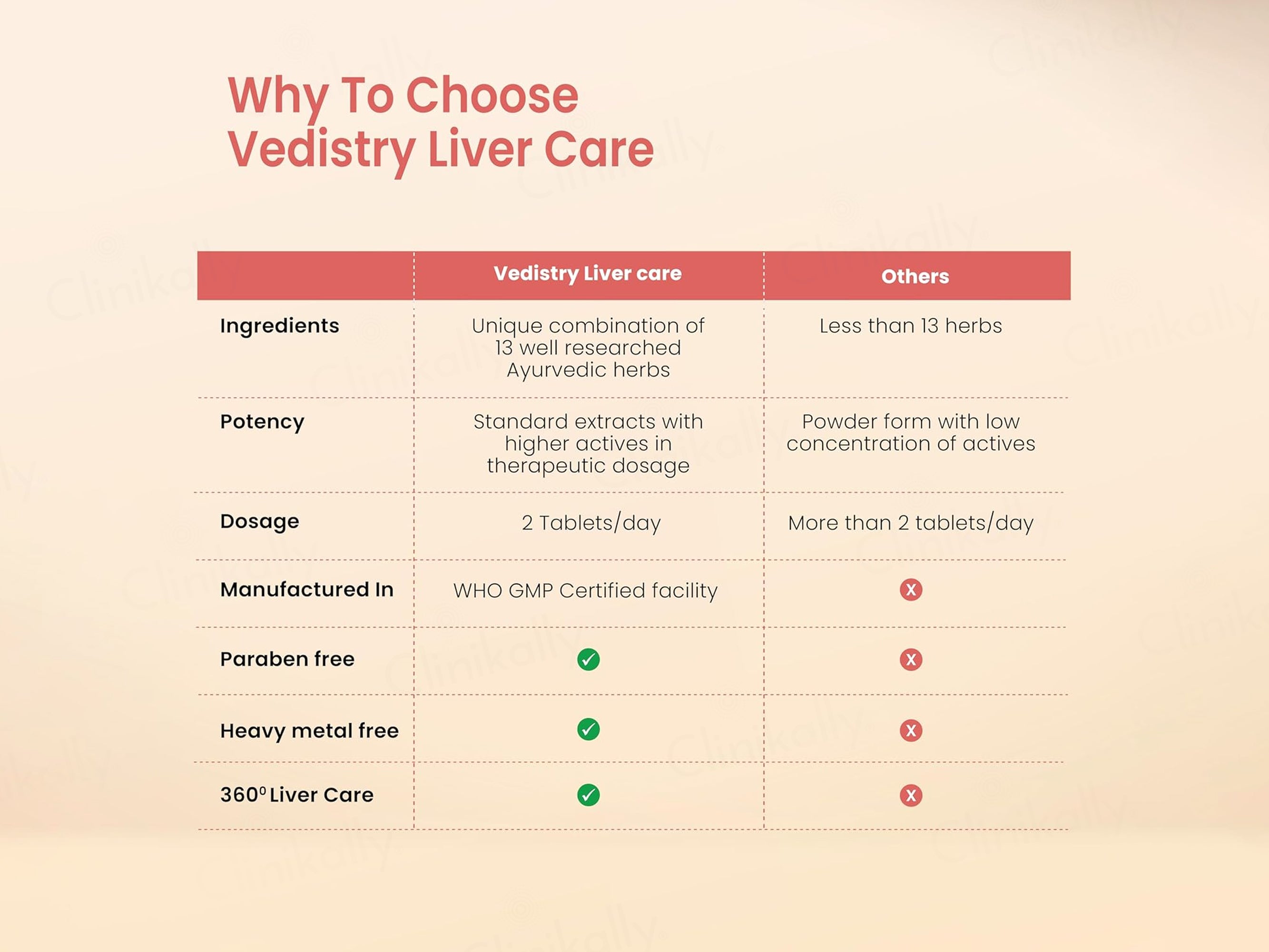 Vedistry Liver Care Ayurvedic Tablet is a natural, paraben-free tonic designed to promote liver health for all adults. Crafted with a blend of 13 researched Ayurvedic herbs like bhumi amalaki, kalmegh, punarnava, sharapunkha, and kutaki, this clinically formulated supplement supports liver function, maintains optimal SGPT/SGOT levels, and aids in fatty liver management. Ideal for daily use, it offers a holistic solution rooted in Ayurveda to enhance liver detox, combat bloating, and boost overall vitality over time.
