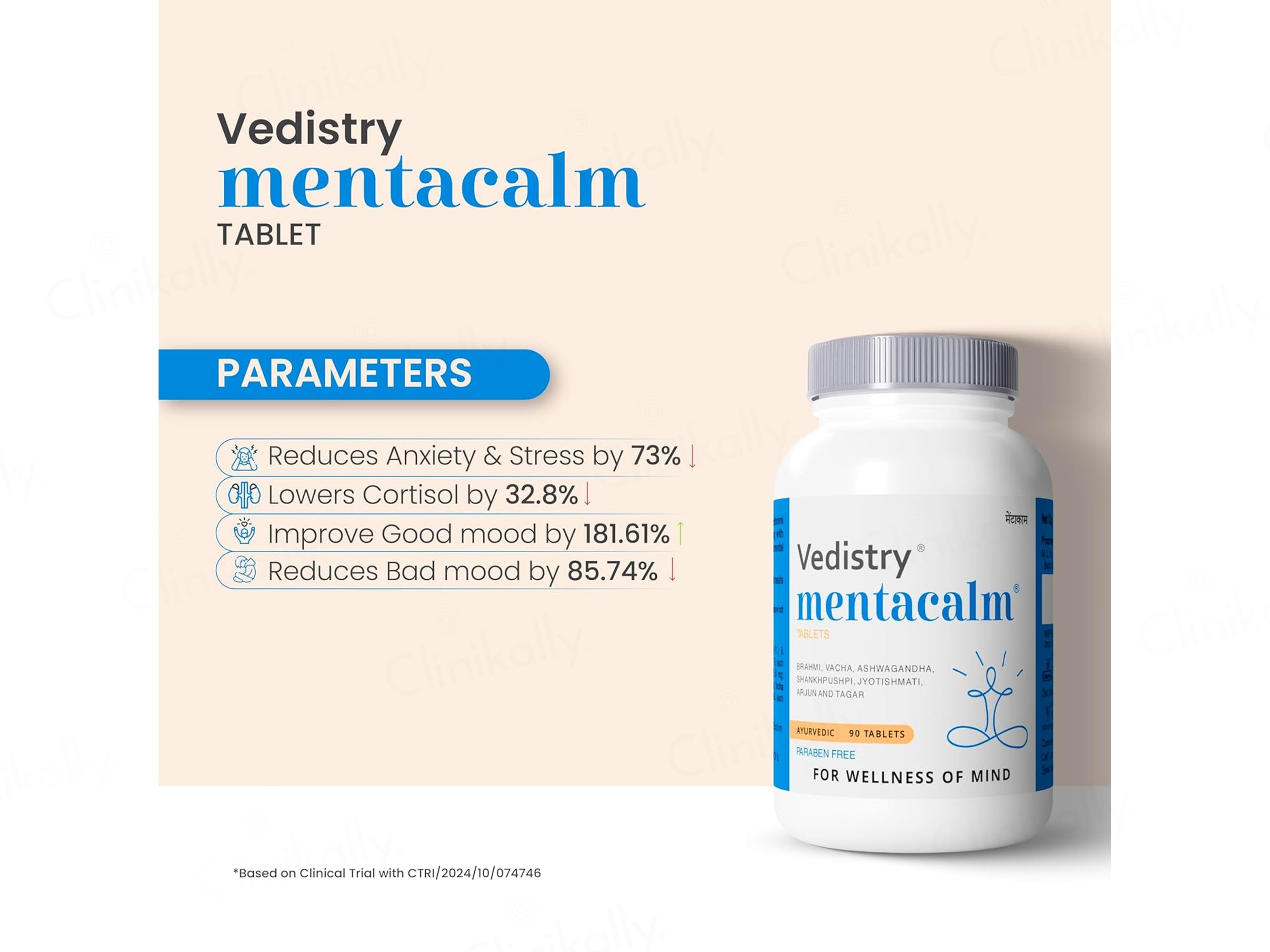 Vedistry Mentacalm Ayurvedic Tablet is a 100% natural, non-addictive, non-drowsy, and sugar-free Ayurvedic formulation crafted to promote mental wellness, relieve daily stress, enhance focus, and support emotional balance without causing sedation. This scientifically balanced blend combines powerful brain-tonic herbs including Brahmi, Shankhapushpi, Ashwagandha, Jyotishmati, Vacha, Arjun, and Tagar to calm the mind, improve concentration, strengthen memory, pacify Vata dosha, and nurture overall cognitive and emotional health for a peaceful, focused, and resilient mind.