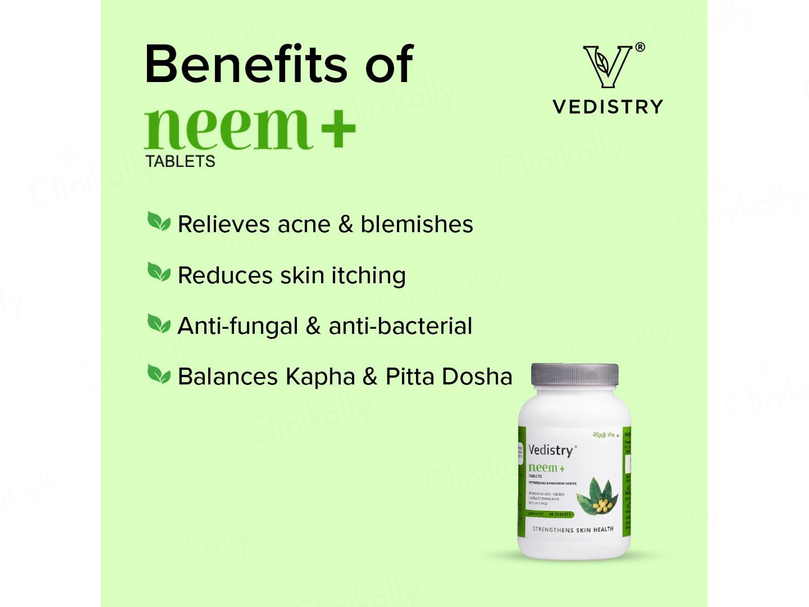 - Take 1 tablet of Vedistry Neem+ Ayurvedic Tablet twice daily after meals with lukewarm water or as advised by your healthcare professional.