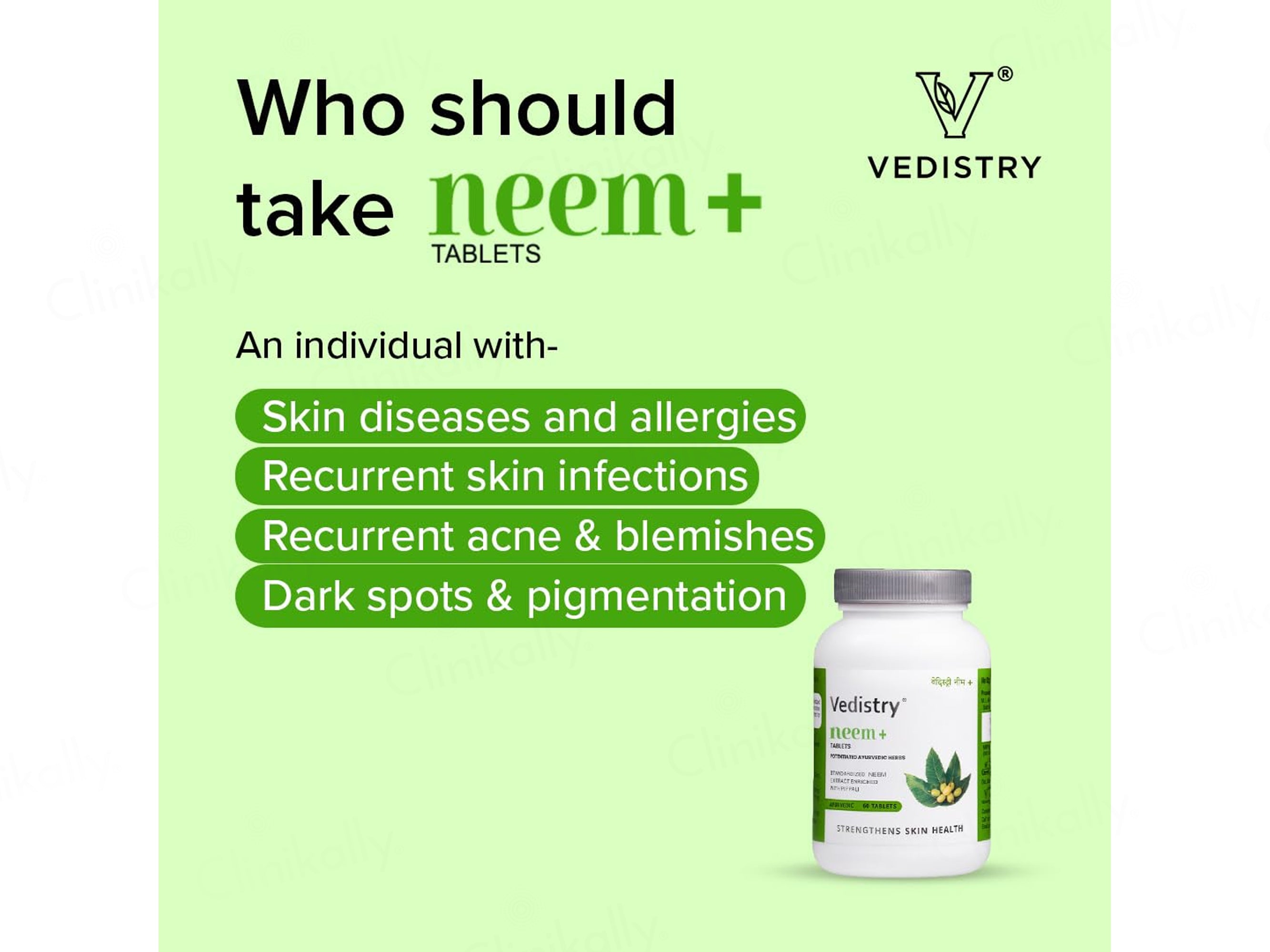 Vedistry Neem+ Ayurvedic Tablet is a natural skin-support formula crafted with potent Ayurvedic herbs to purify the blood, soothe skin irritations, and strengthen overall wellness, powered by standardized Neem powder, Neem extract, potentiated Neem extract, and Long Pepper (Piperine) extract for enhanced absorption. Enriched with the Bhavna traditional process and boosted with Piperine for higher bioavailability, it helps clear skin concerns like acne, itching, and rashes while supporting detoxification, immunity, and microbial defense for long-term skin and body balance.