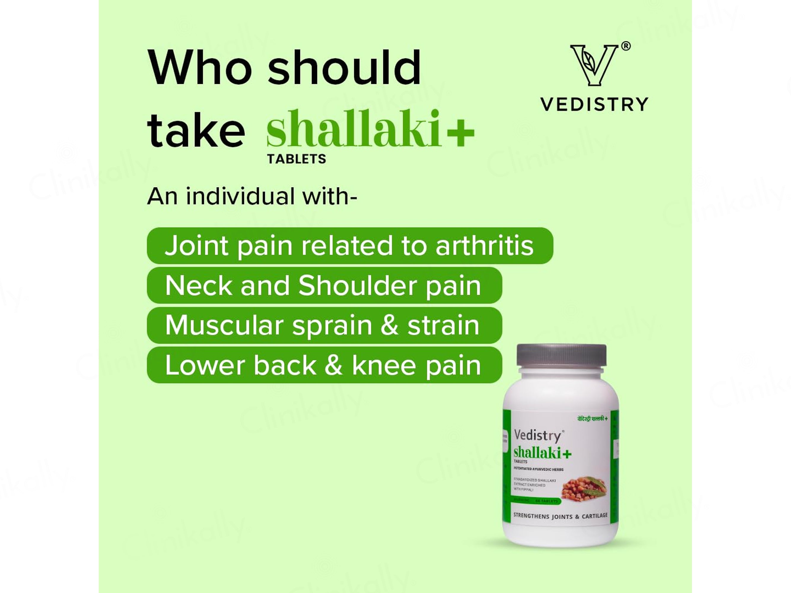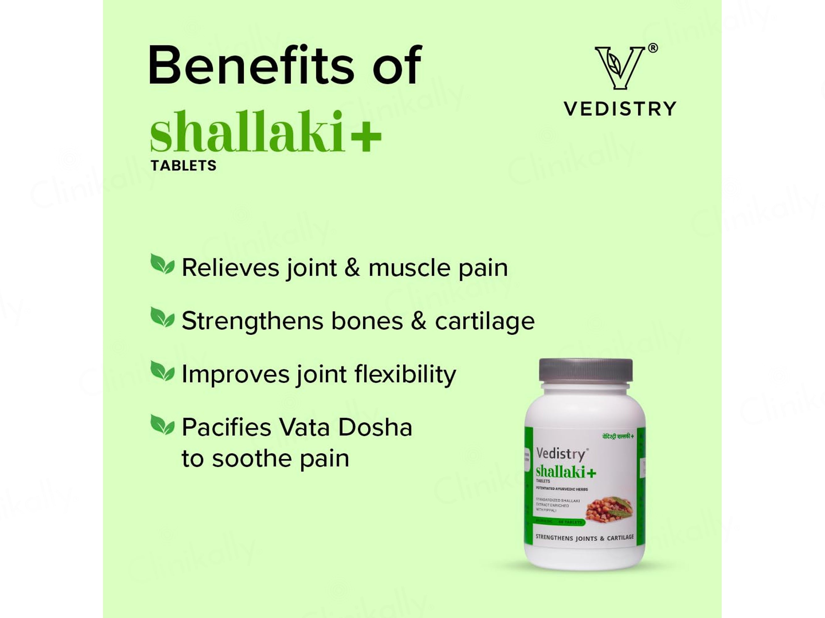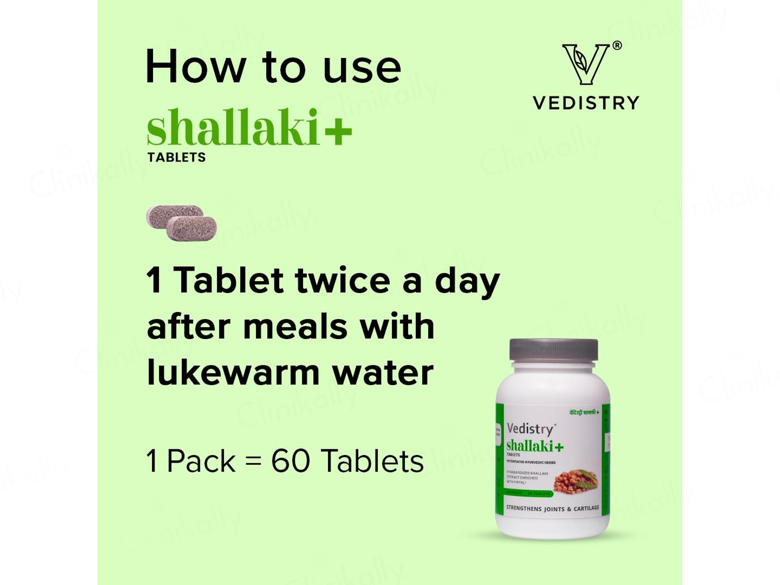 - Take 1 Vedistry Shallaki+ Ayurvedic Tablet twice daily with lukewarm water after meals; use consistently for 3 months for best results or as directed by physician.
