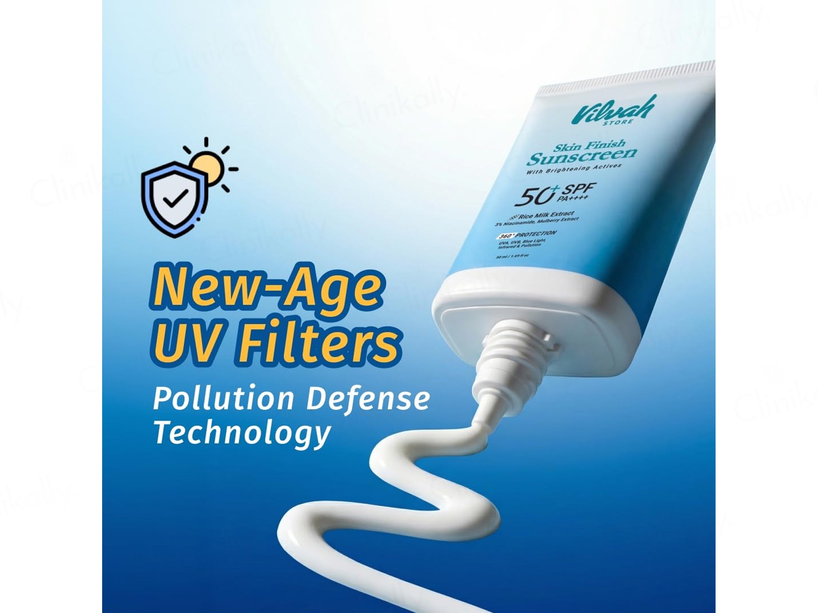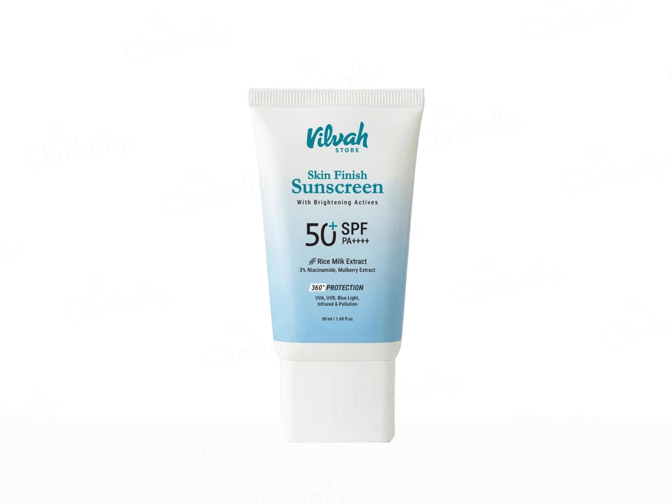 - Reapply Vilvah Store Skin Finish Brightening Sunscreen SPF 50+ PA++++ every 2-3 hours, or after sweating or swimming.