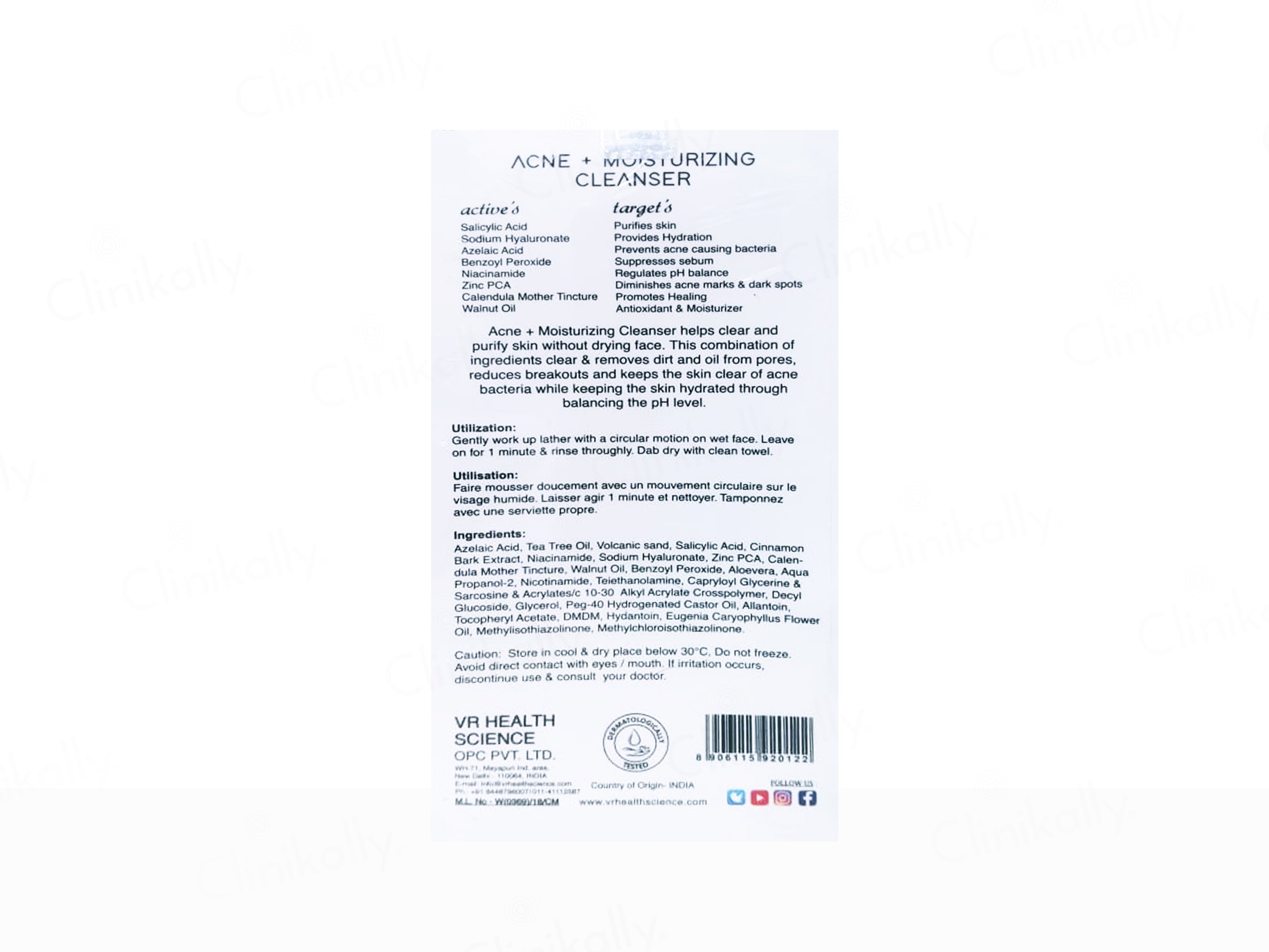 VRH Acne+ Moisturizing Cleanser is a dermatologically tested product designed to purify and hydrate acne-prone skin. Infused with Salicylic Acid, Sodium Hyaluronate, and Benzoyl Peroxide, it controls oil, prevents bacteria, and heals dark spots, making it ideal for daily use on oily or combination skin types.
