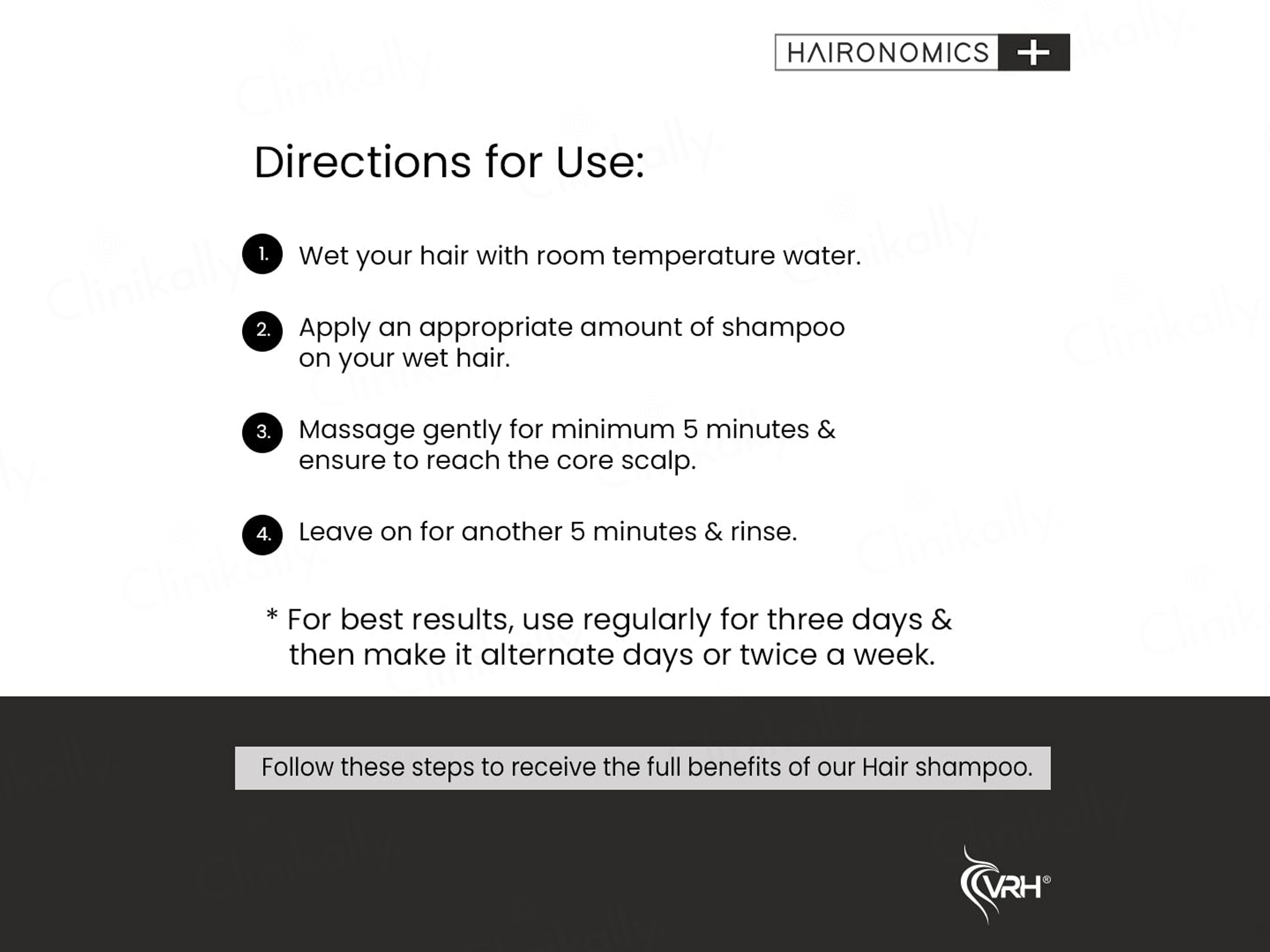 Apply on wet hair, massage for 5 minutes, rinse thoroughly, and use 2-3 times weekly.