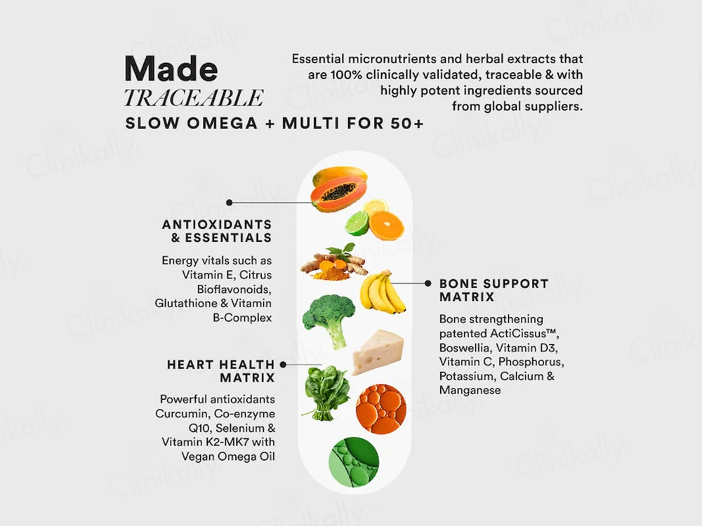 Wellbeing Nutrition's Slow Multi + Omega For Adult 50+ Capsule is a meticulously crafted daily supplement tailored for individuals aged 50 and above. This advanced formula combines 39 essential nutrients suspended in pure vegan omega oil to support bone, joint, and cardiovascular health, while addressing nutrient gaps associated with aging. Utilizing patented 2-in-1 delayed-release technology, the capsule ensures sustained nutrient delivery over 8 hours, promoting enhanced energy levels, cognitive function, and overall vitality. Free from artificial additives and common allergens, it offers a clean and effective solution for healthy aging.