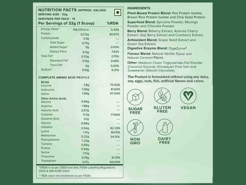 It's a vegan blend of Golden European Pea, Brown Rice, Chia Seed Proteins, superfoods, and digestive enzymes, aimed at holistic health.
