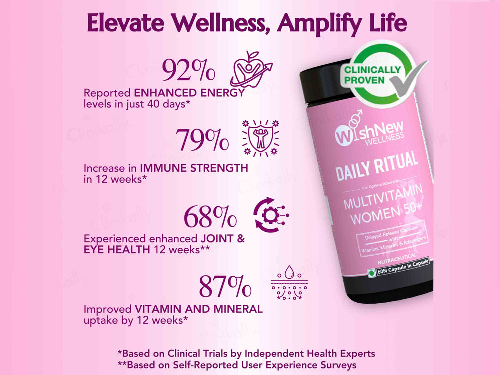WishNew Wellness Daily Ritual Multivitamin Capsule For Women 50+ is uniquely formulated to address the specific nutritional needs of women aged 50 and above. It includes a balanced mix of essential vitamins, minerals, and antioxidants that support bone health, cardiovascular health, vision, energy levels, and immune function, catering specifically to the health concerns of mature women.